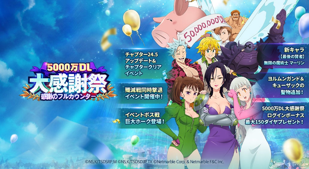 ネットマーブルは、スマートフォン向けシネマティックアドベンチャーRPG『七つの大罪 ~光と闇の交戦(ひかりとやみのグランドクロス)~』(略称:グラクロ)において、本日9月29日(木)に実施した最新アップデートより、全世界5000万DL大感謝祭イベントを開催することをお知らせいたします。
