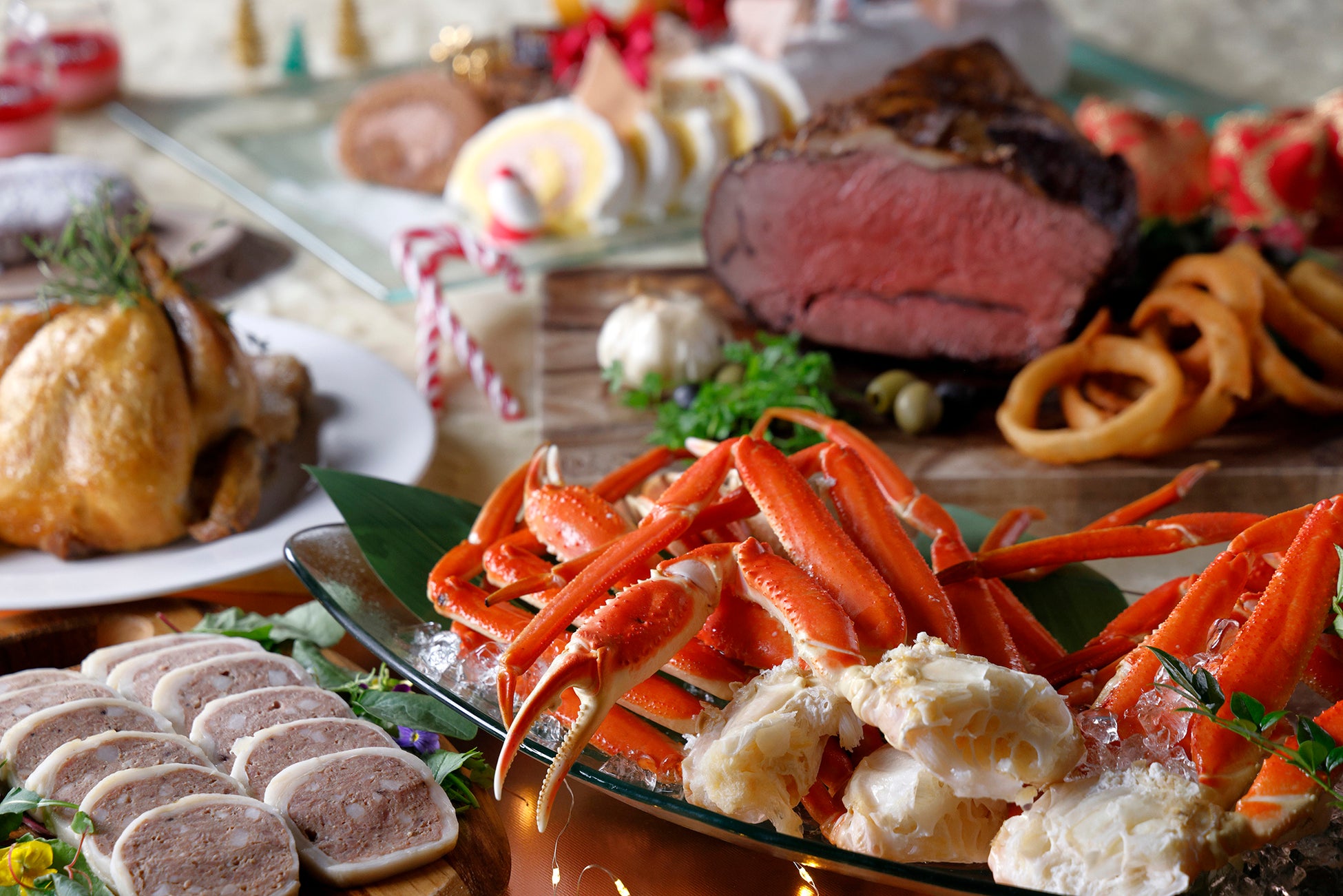 期間中のフェア「シーフードブッフェ」に加え、“ローストチキン”や“本ずわい蟹のボイル”(ディナーのみ)も登場。デザートには、“シュトーレン”や“ブッシュドノエル”(ディナーのみ)など、クリスマスを盛り上げるとっておきのメニューをお届けします。