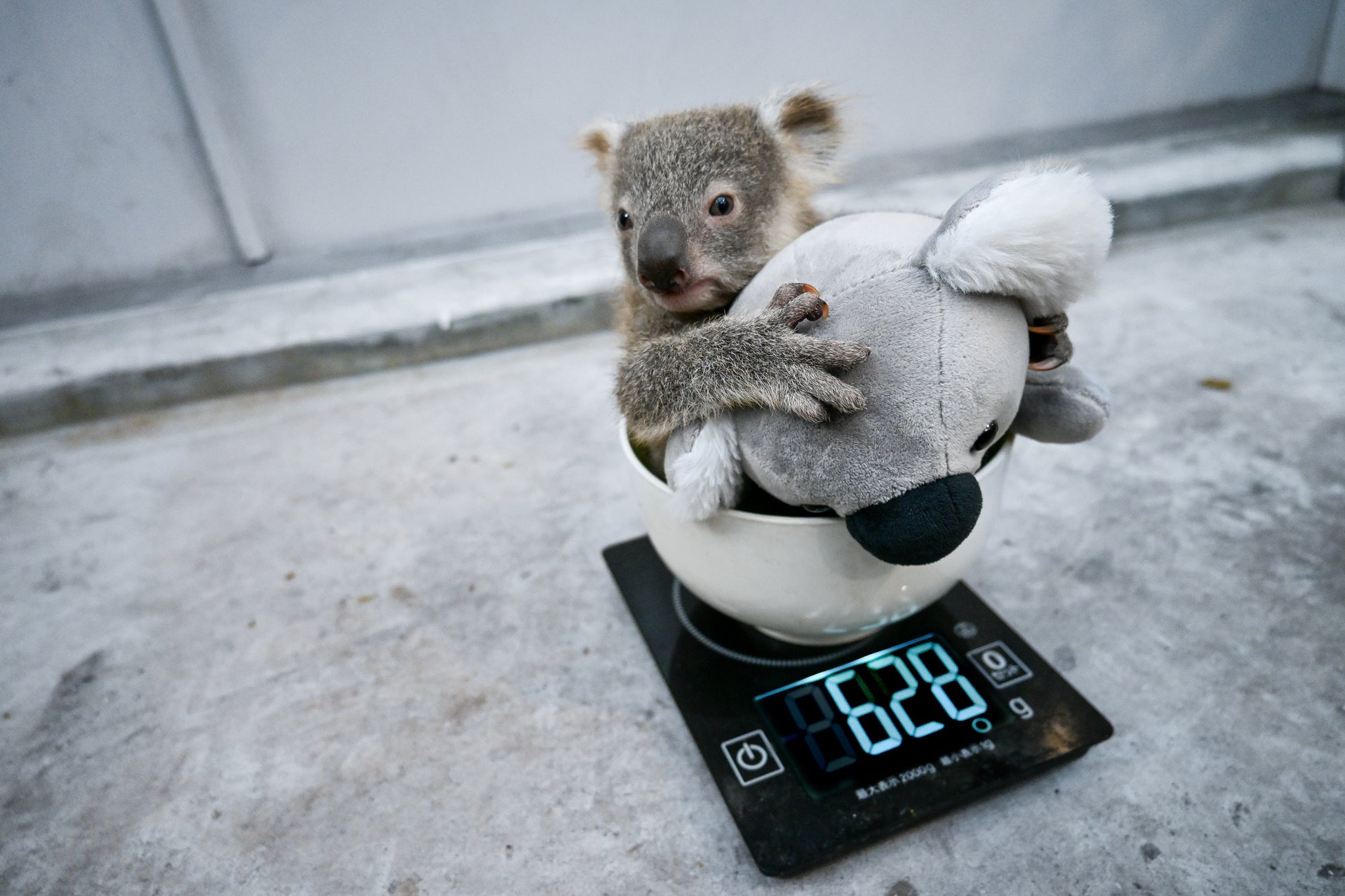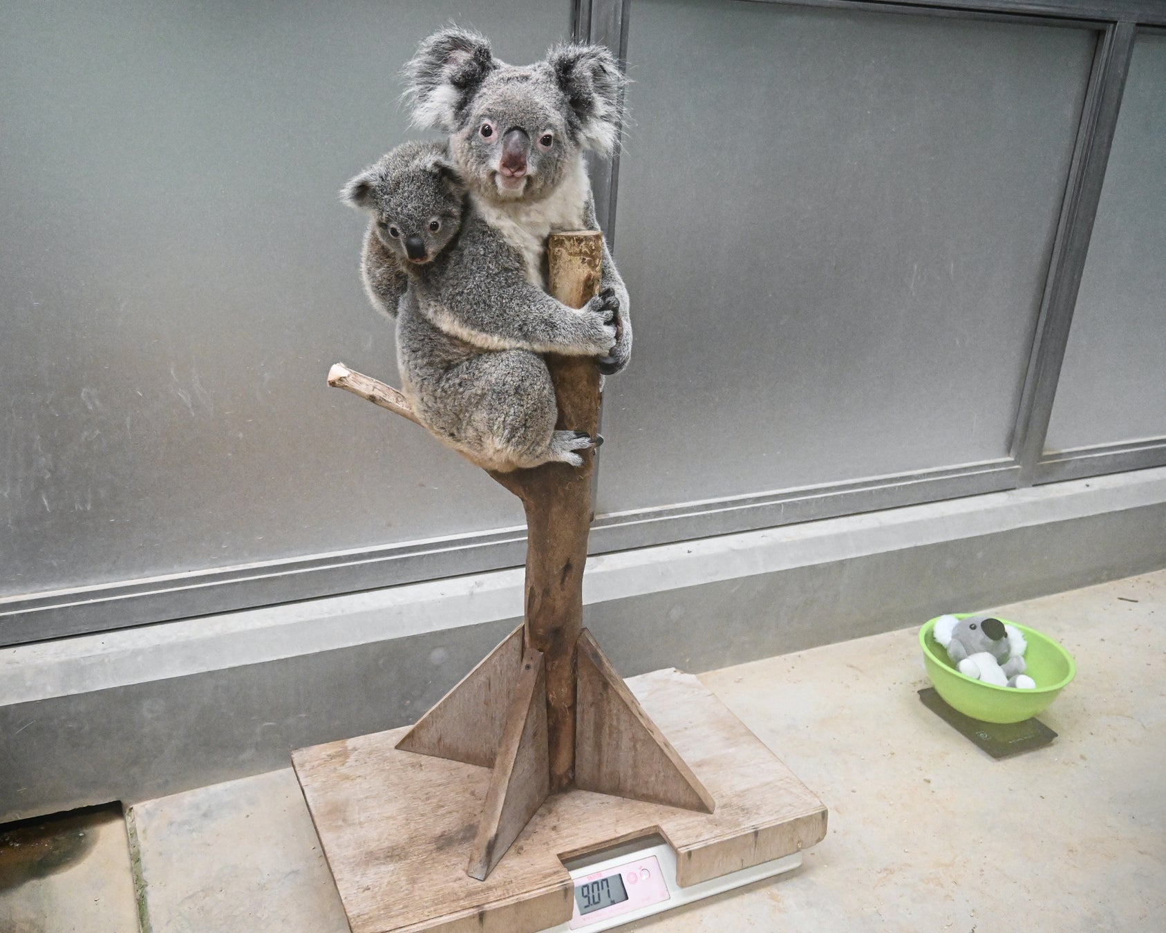 生まれて間もない子供は母親から離すことができないため、母コアラの測定の時も一緒にくっついたまま行います。