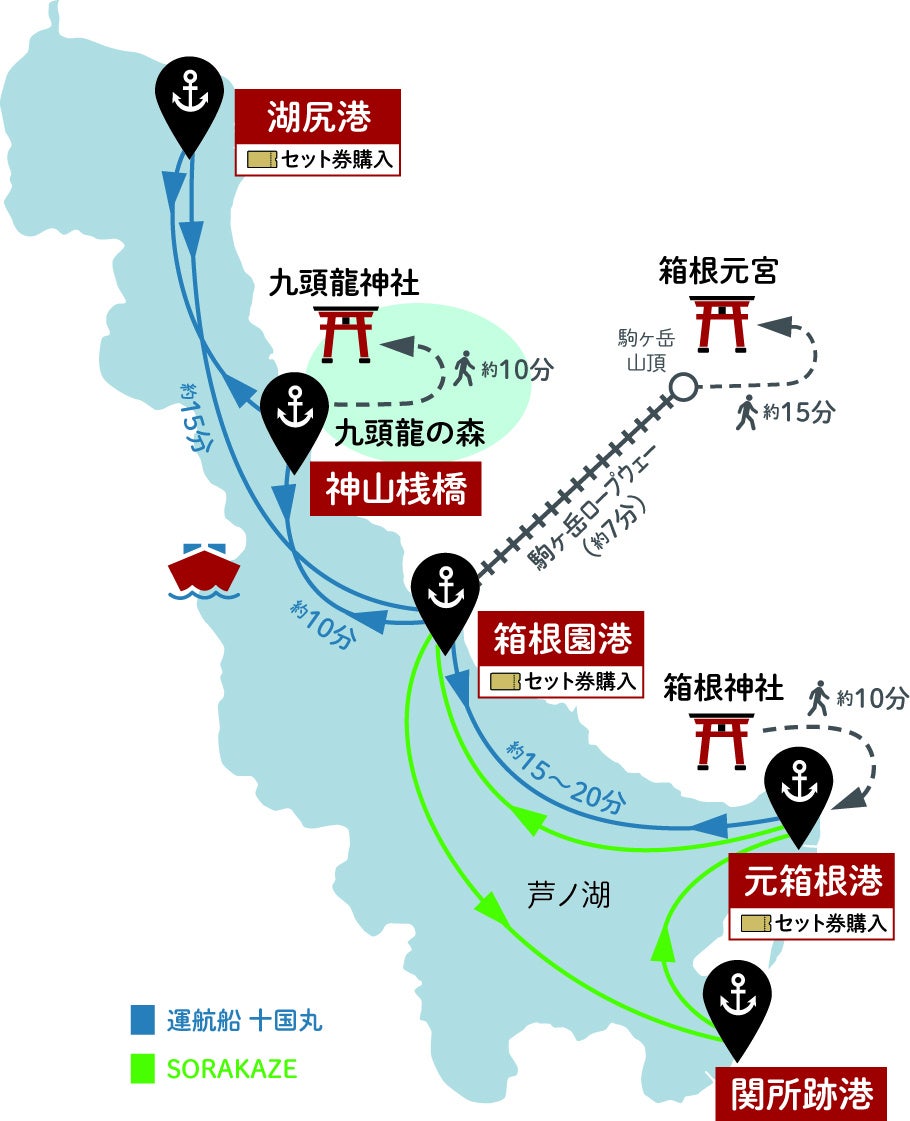 湖尻港発(10:00)→箱根園港着(10:15)→徒歩10分→箱根駒ヶ岳ロープウェー乗車(10:40)→箱根元宮参拝→箱園港発(12:05)→九頭龍の森着(12:15)→徒歩10分→九頭龍神社参拝→九頭龍の森発(12:55)→元箱根港着(13:20)→徒歩10分→箱根神社参拝→湖尻港着(15:15)