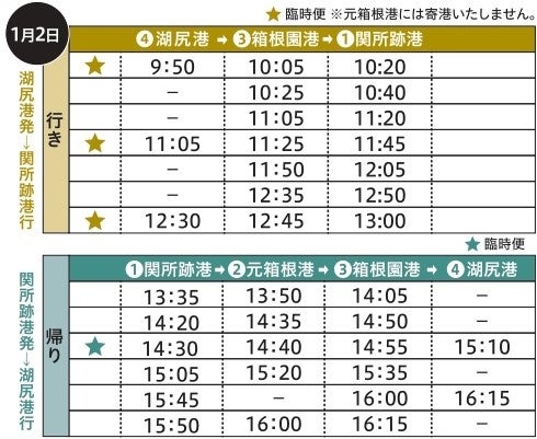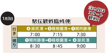 1月2日(木)、3日(金)の2日間、箱根駅伝のゴール・スタート地点に近い「関所跡港」へのアクセスに便利な臨時便を運航します。