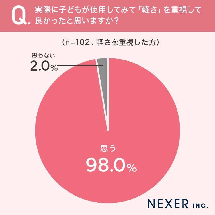 98%とほとんどの方が、実際に子どもが使用してみて「軽さ」を重視して良かったと思う、と回答しています。