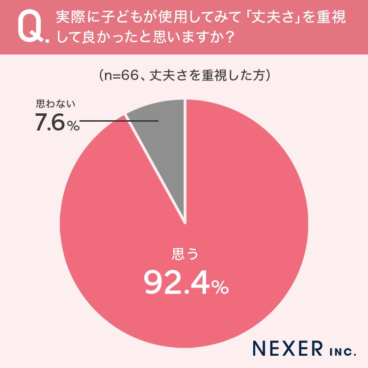 「丈夫さ」も92.4%と、ほとんどの方が実際に子どもが使用してみて「丈夫さ」を重視して良かったと思う、と回答しています。