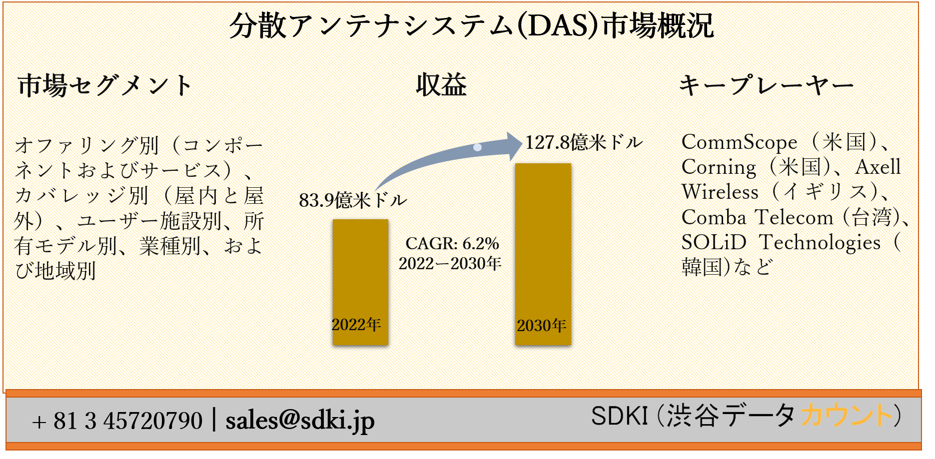 分散アンテナシステム(DAS)市場は、2022年に83.9億米ドルの市場価値から、2030年までに127.8億米ドルに達すると推定され、2022-2030年の予測期間中に6.2%のCAGRで成長すると予想されています。