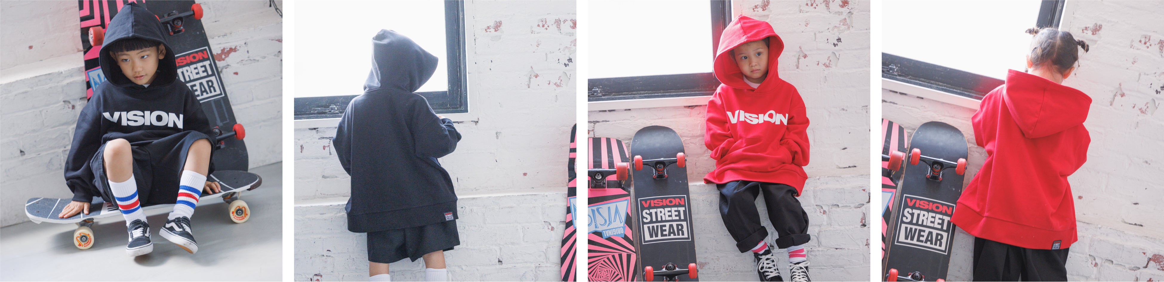 VISION STREET WEARは、今年の春より新たにキッズラインの展開を開始しました。VISION STREET WEARがキッズアイテムのコラボレーションを行うのは、今回が初めてです。近年、オリンピック競技になったことで更に注目を浴びているスケートボードは、競技自体のかっこよさはもちろん、ファッションも注目ポイントのひとつ。今回、ローリーズファームキッズではパーカー2型とソックス1型の計3型を展開します。パーカーにはスケーターブランドらしいグラフィックやロゴをデザインに落とし込み、あえてオーバーシルエットに仕上げたことでスケーターファッションならではの着こなしができます。ソックスはローリーズファームキッズのオリジナルカラーを使用したラインデザインでコーディネートのポイントにもおすすめ。既存のラインアップとは一味違う、ストリート感を味わえる楽しいアイテムです。(※ソックスのみZOZOTOWNでは、予約が出来かねますのでご了承ください。)