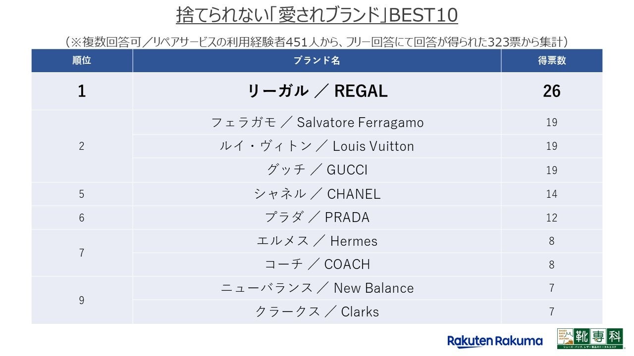 さらに、リペア(修理)の需要が高く、長く使い続けられる「愛されブランド」を明らかにすべく、「リペア(修理)サービスの利用経験」が「ある」と回答したユーザーを対象に、リペアサービスに出したことがあるブランド名をフリー回答で聴取しました。その結果、「リーガル/REGAL」(26票)が最も多く、次いで、「フェラガモ/Salvatore Ferragamo」、「ルイ・ヴィトン/Louis Vuitton」、「グッチ/GUCCI」(各19票)が同票で2位となりました。