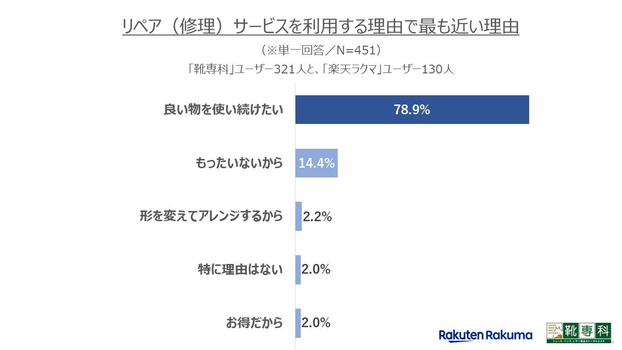続いて、「リペア(修理)サービスの利用経験」が「ある」と回答した「楽天ラクマ」ユーザー(N=130)と、「靴専科」ユーザー(N=321)の計451人を対象に、「リペア(修理)サービスを利用する理由」について質問をしました。その結果、「良い物を使い続けたい」(78.9%)が約8割を占めることがわかりました。