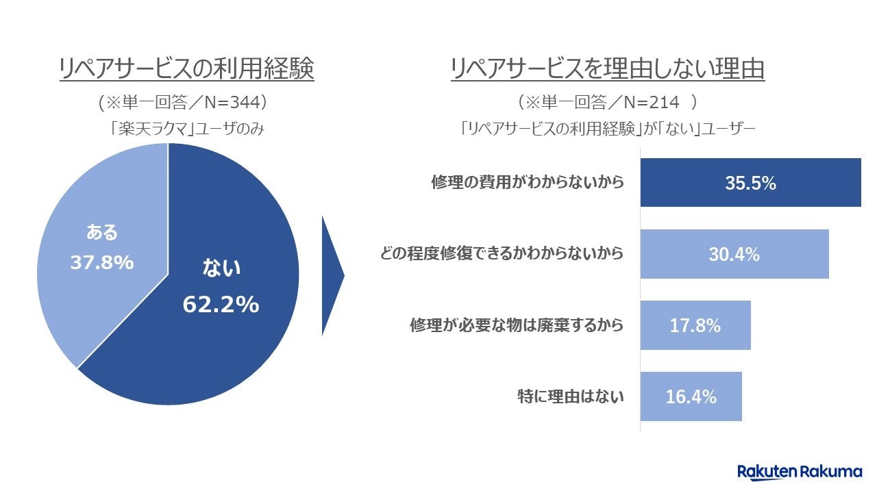 まず、「楽天ラクマ」ユーザー344人を対象に、「リペア(修理)サービスの利用経験」について質問したところ、「ない」(62.2%)が過半数に達していることがわかりました(注1)。また、「ない」と回答したユーザーに、「リペア(修理)サービスを利用しない理由」について質問したところ、「修理の費用がわからないから」(35.5%)が最も多く、次いで「どの程度修理されるかわからないから」(30.4%)、「修理が必要な物は廃棄するから」(17.8%)となりました。この結果から、状態が悪い商品についてリペアよりも廃棄を優先するユーザーは2割以下となり、必ずしも廃棄を前提として考えていないユーザーが多数派である一方、リペア(修理)についてコストや修理後の状態などがイメージしにくいなどの課題があることがわかりました。