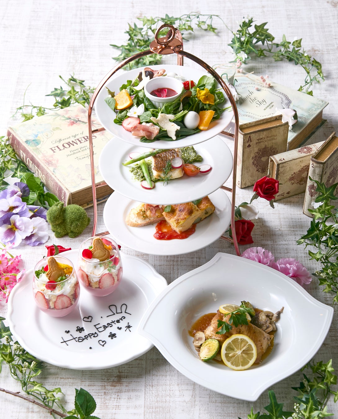 愛らしい白うさぎのショートケーキやアリスサブレ、イースターエッグチョコなど、思わず写真を撮りたくなるスイーツが並びます。さらに、イースターに欠かせない卵を使ったセイボリーもラインナップ。飲み放題のドリンクとともに、Easter Tea Partyをご堪能ください。
