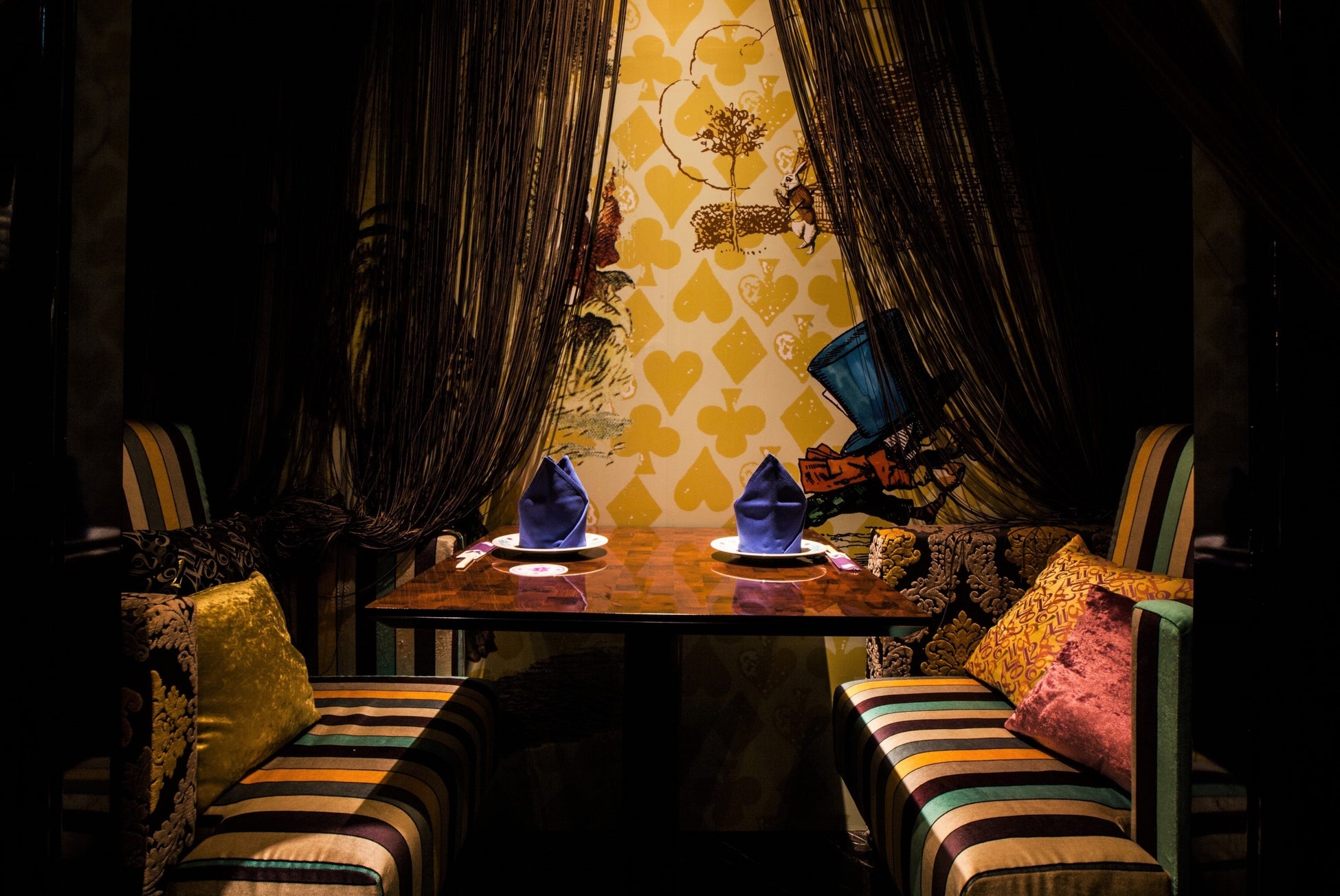 「ハートの女王」ご自慢のキラキラ光るトランプの鏡や色とりどりの玉座が並ぶオープンフロア、「いかれ帽子のマッドハッター」がバターやジャムを塗って壊してしまったハチャメチャな時を刻む時計に囲まれたボックスシート、「トランプ兵」がドリンクミーを飲んで大きくなりすぎてしまった半個室席など、へんてこで魅力的な住人をモチーフにしたお席たちがあなたの来国を心待ちにしています!