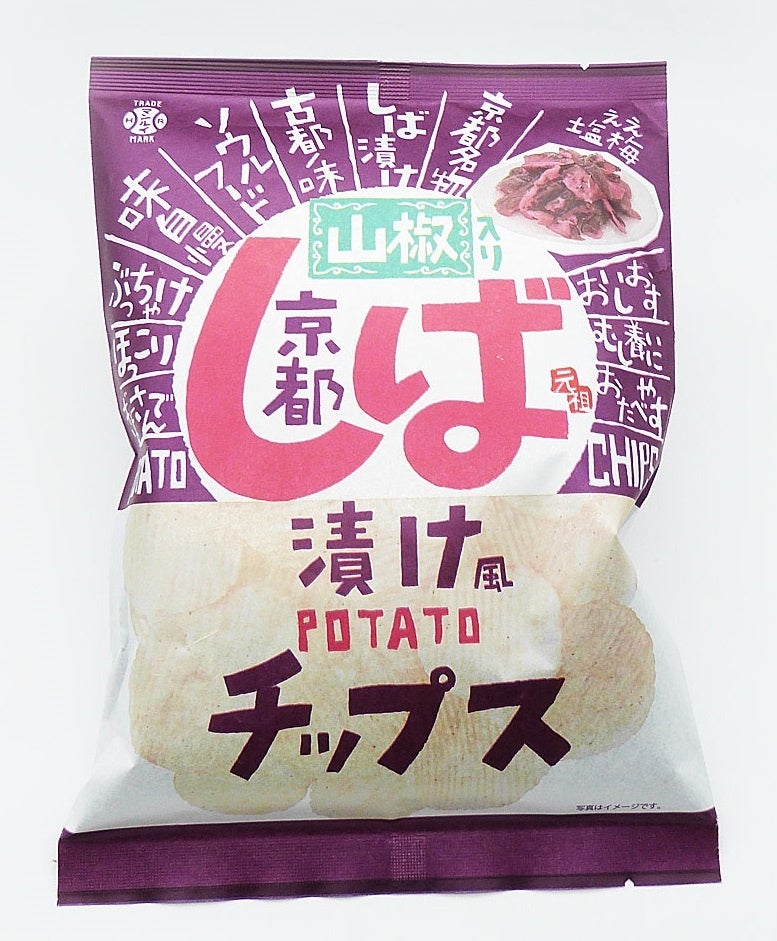 京の三大漬物の1つと言われるしば漬けの酸味に山椒のアクセントを効かせた、食べ出したら止まらないクセになるポテトチップスです。しば漬けの味そのままで、驚きの美味しさです。まだ食べていない方はぜひ。