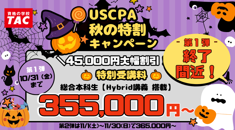 【TAC】USCPA講座「秋の特割キャンペーン第1弾」受講料大幅割引で30万円台!10/31(金)まで!終了間近!