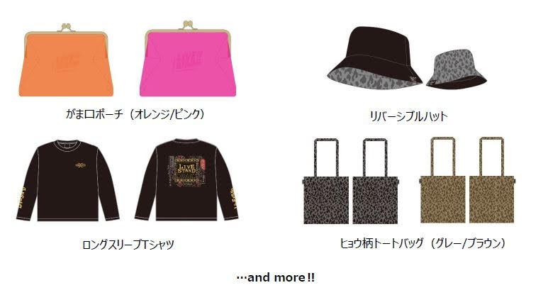 複数の会場で楽しめる大阪公演ならではの、屋外で役立つ「リバーシブルハット」や「ロングスリーブTシャツ」、さらに大阪らしさを感じさせる「がま口ポーチ」や「ヒョウ柄トートバッグ」など、LIVE STANDをより楽しむためのグッズを数多く取り揃えています。
