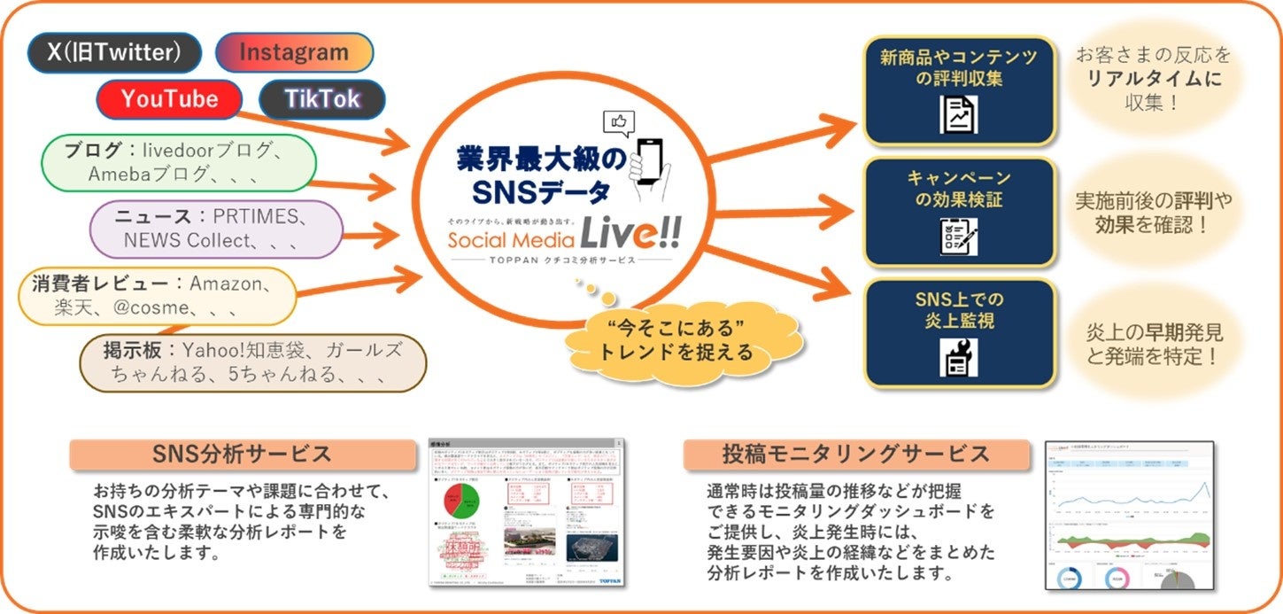 TOPPANホールディングスのグループ会社であるTOPPAN株式会社(本社:東京都文京区、代表取締役社長:大矢 諭、以下 TOPPAN)は、SNSのクチコミ情報分析サービス「Social Media Live!!(ソーシャルメディアライブ)」を2010年から提供しています。