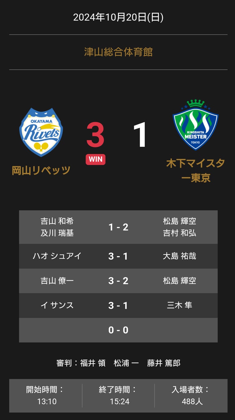 岡山リベッツと木下マイスター東京の試合は、3-1で岡山リベッツが勝利しました。