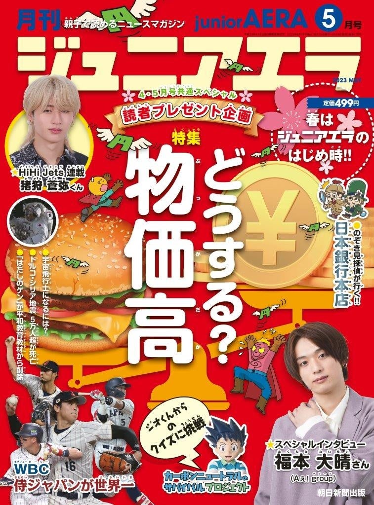 親子で楽しく読めて、中学受験・高校入試の勉強にも役立つニュース月刊誌「ジュニアエラ」が4月14日(金)に発売されました。5月号の特集は「どうする?物価高」。ニュース解説は「宇宙飛行士になるには?」などを掘り下げて紹介。スペシャルインタビューは、関西ジャニーズJr.「Aぇ! group」の福本大晴さん、HiHi Jets連載は、猪狩蒼弥くんが登場します。すごろく、顕微鏡、カードゲーム、本など、キッズにうれしい読者プレゼント企画もあります。