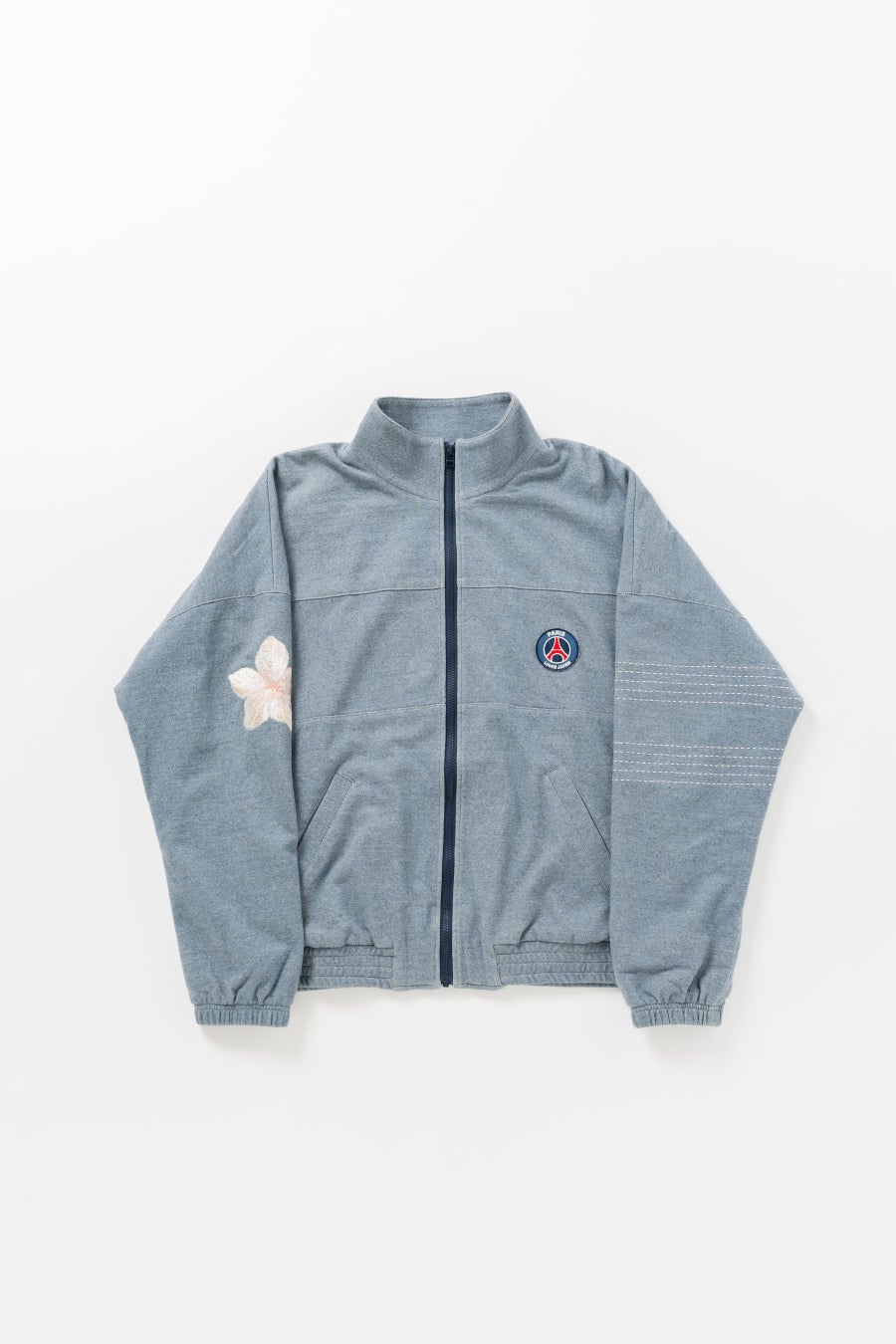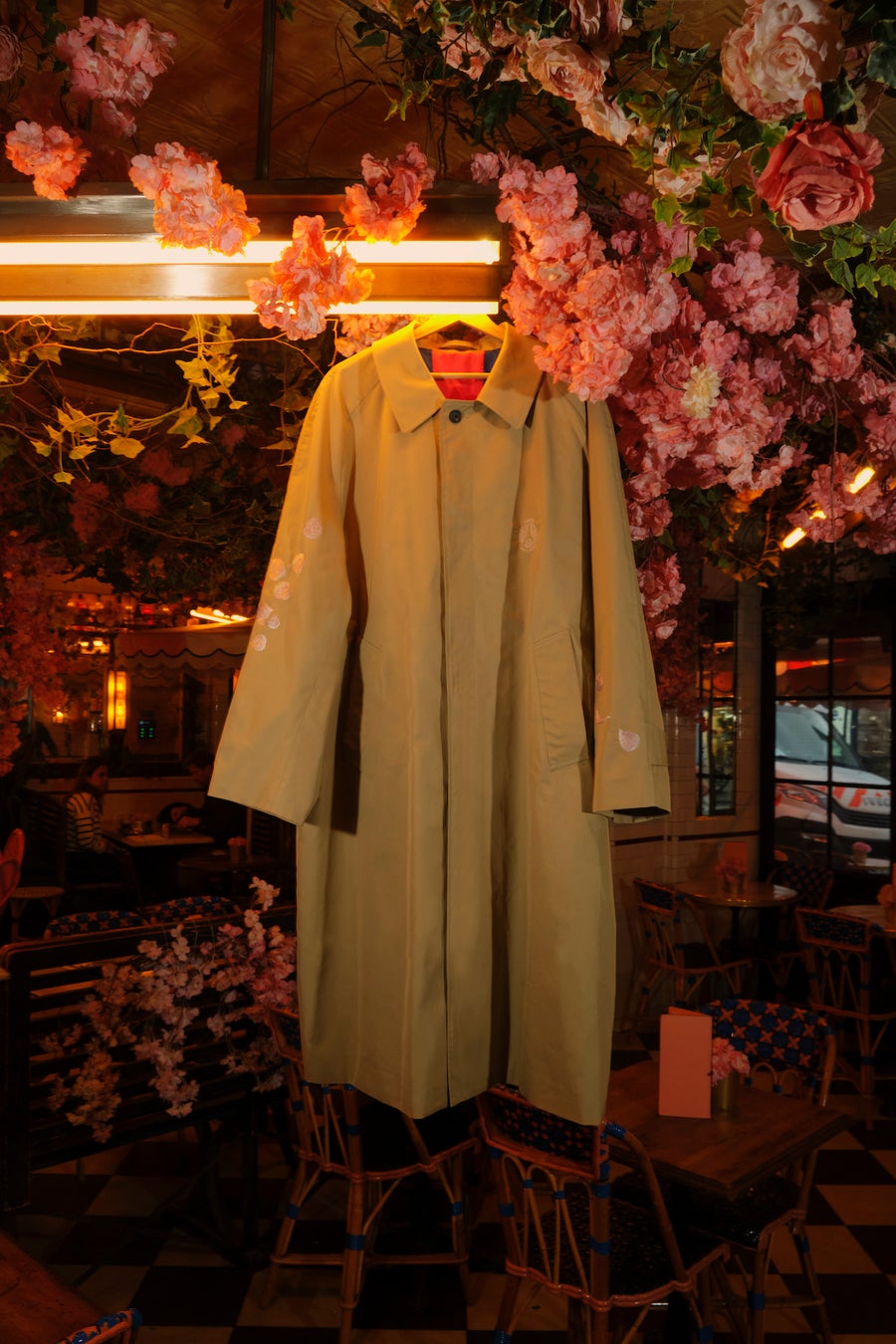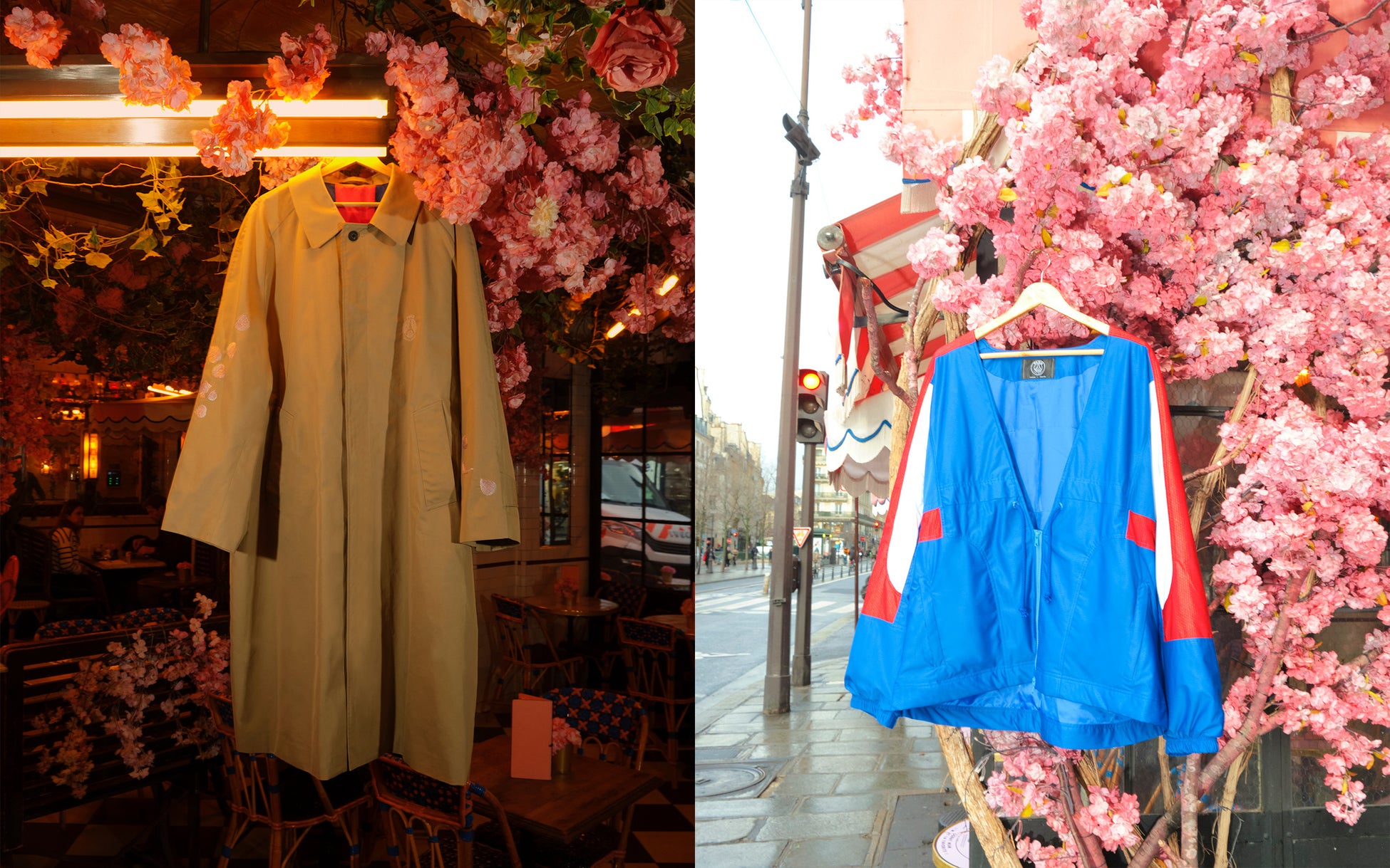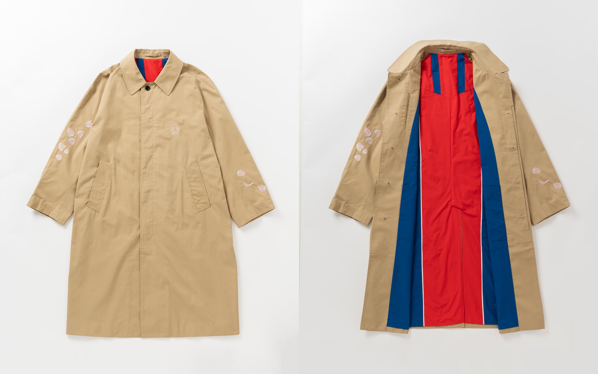 バルカラーコートに関しては、スウェットと同じく桜の花びらの刺繍、そして裏地には90年代のPSGのユニフォームからインスパイアされた柄が大胆にあしらわれています。