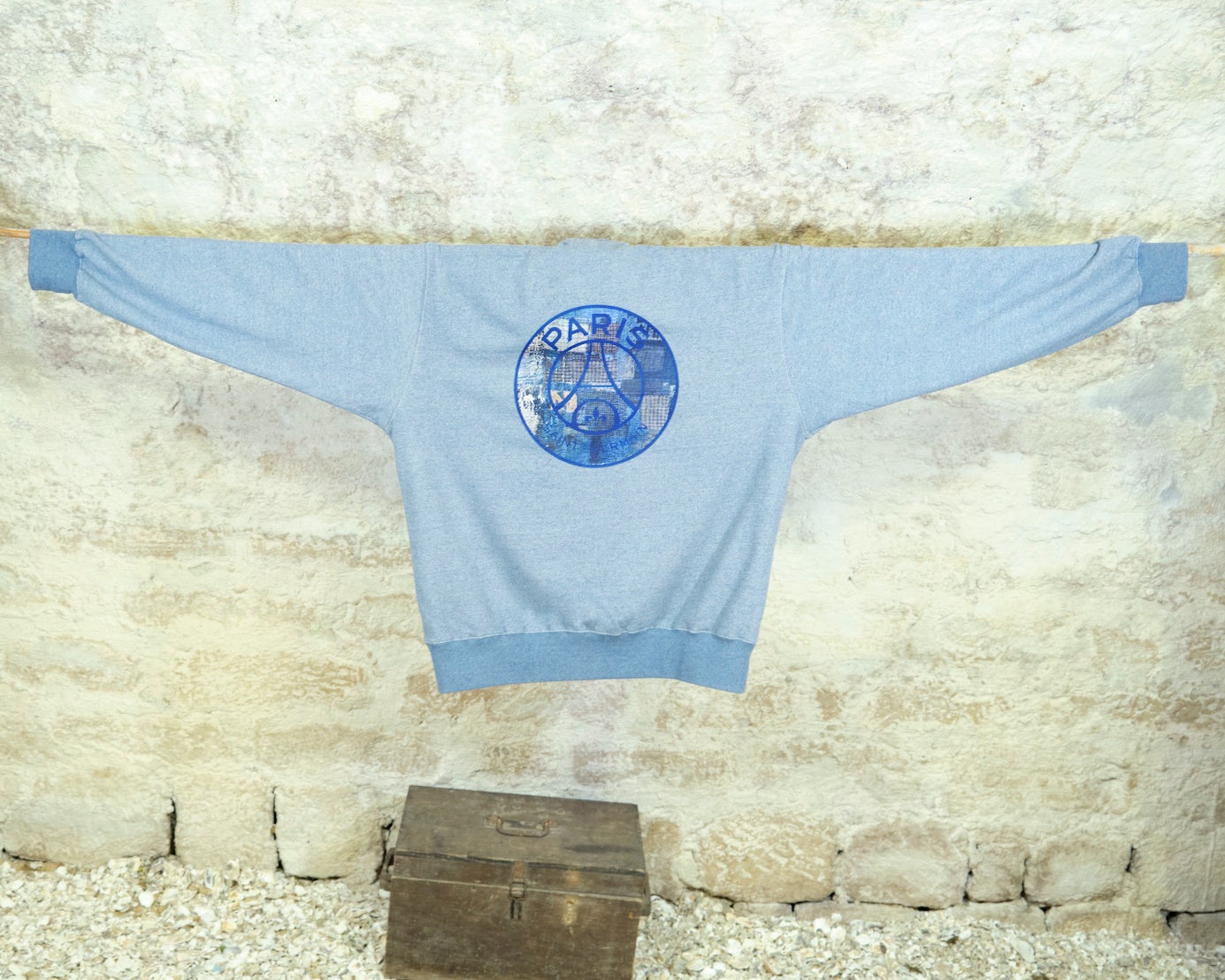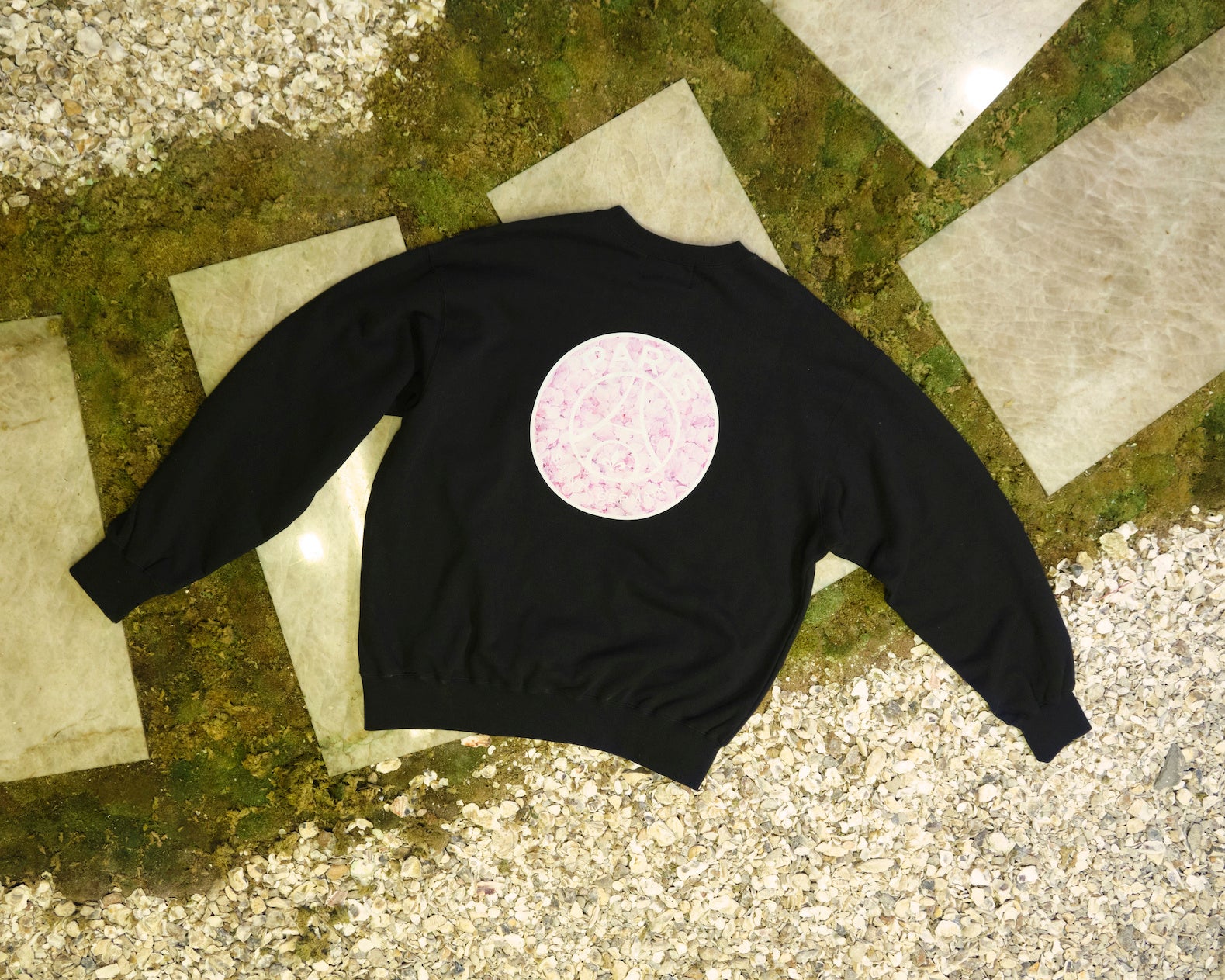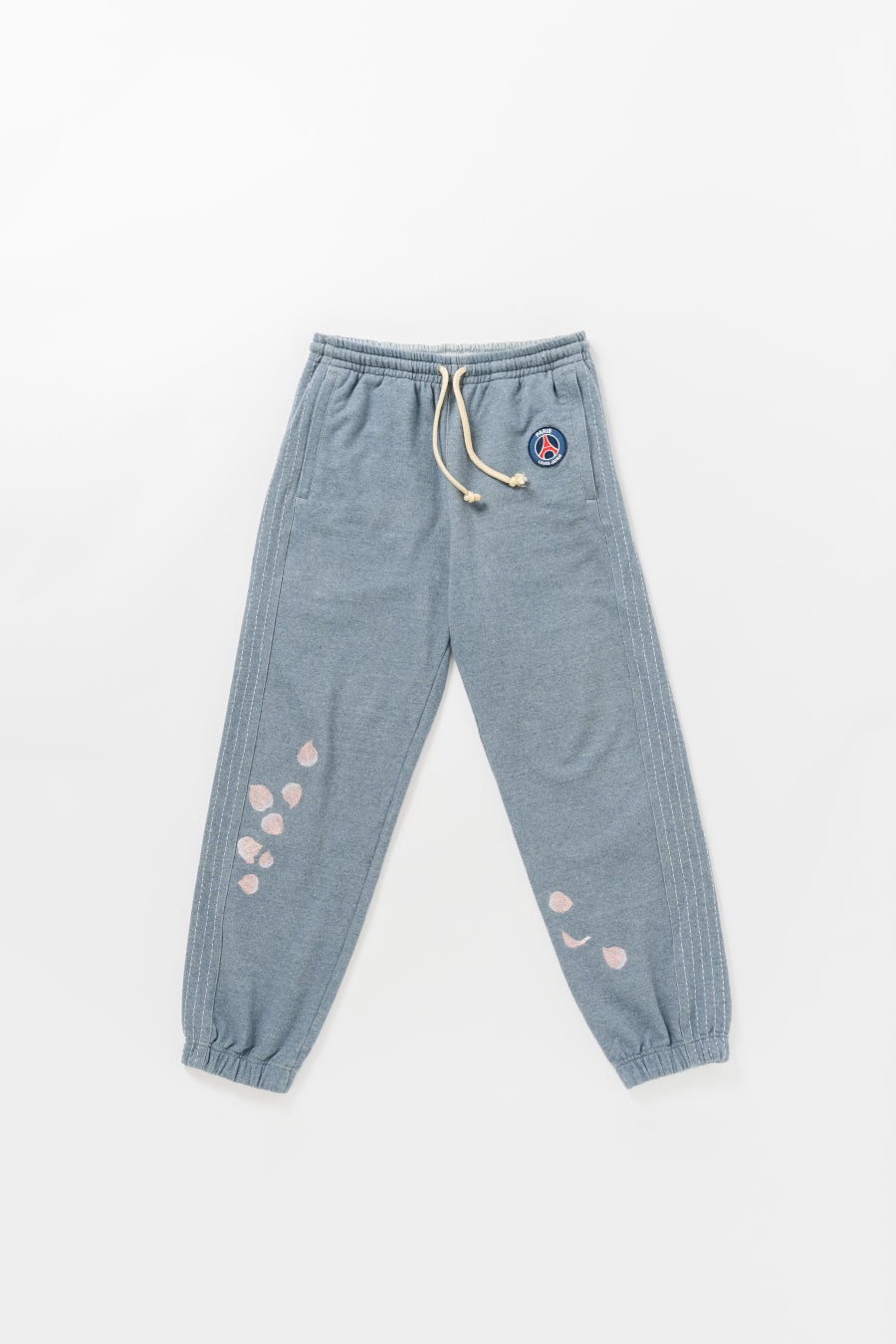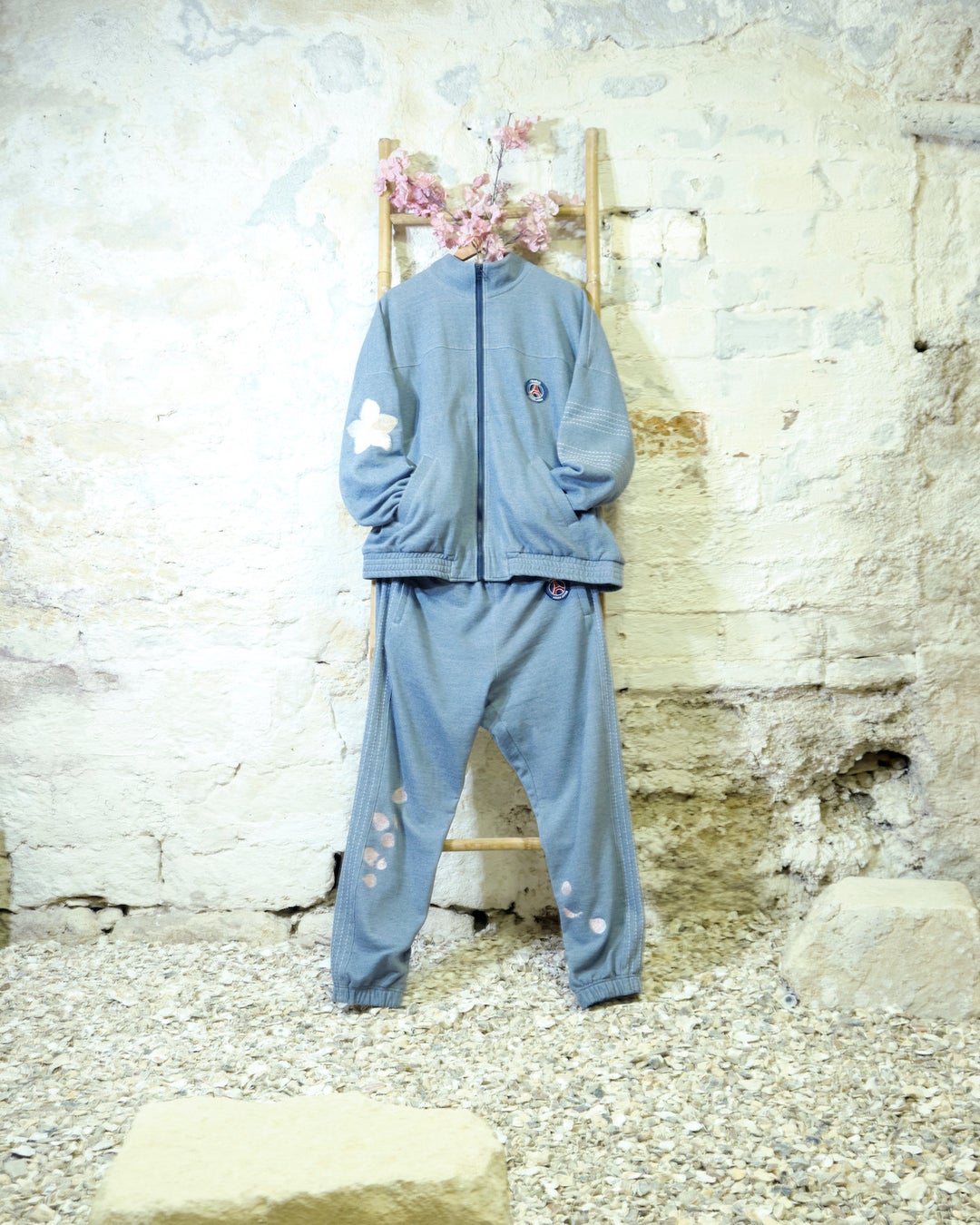 バルカラーコートに関しては、スウェットと同じく桜の花びらの刺繍、そして裏地には90年代のPSGのユニフォームからインスパイアされた柄が大胆にあしらわれています。