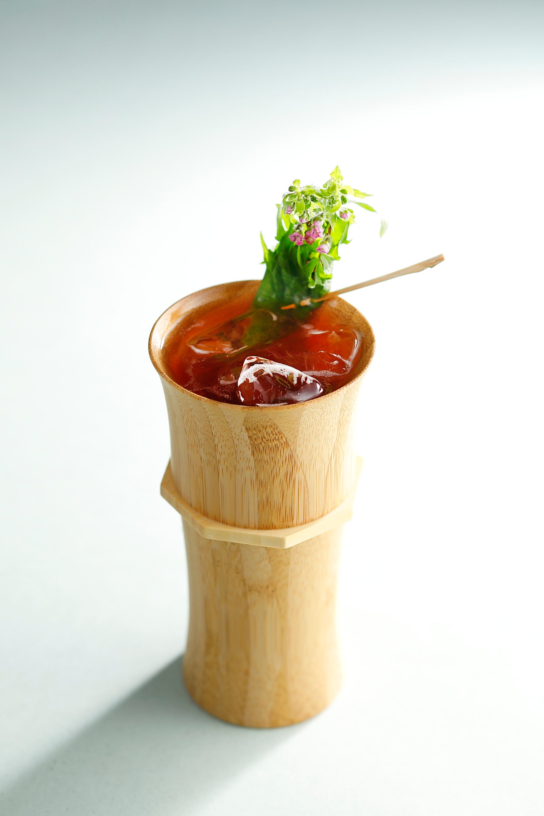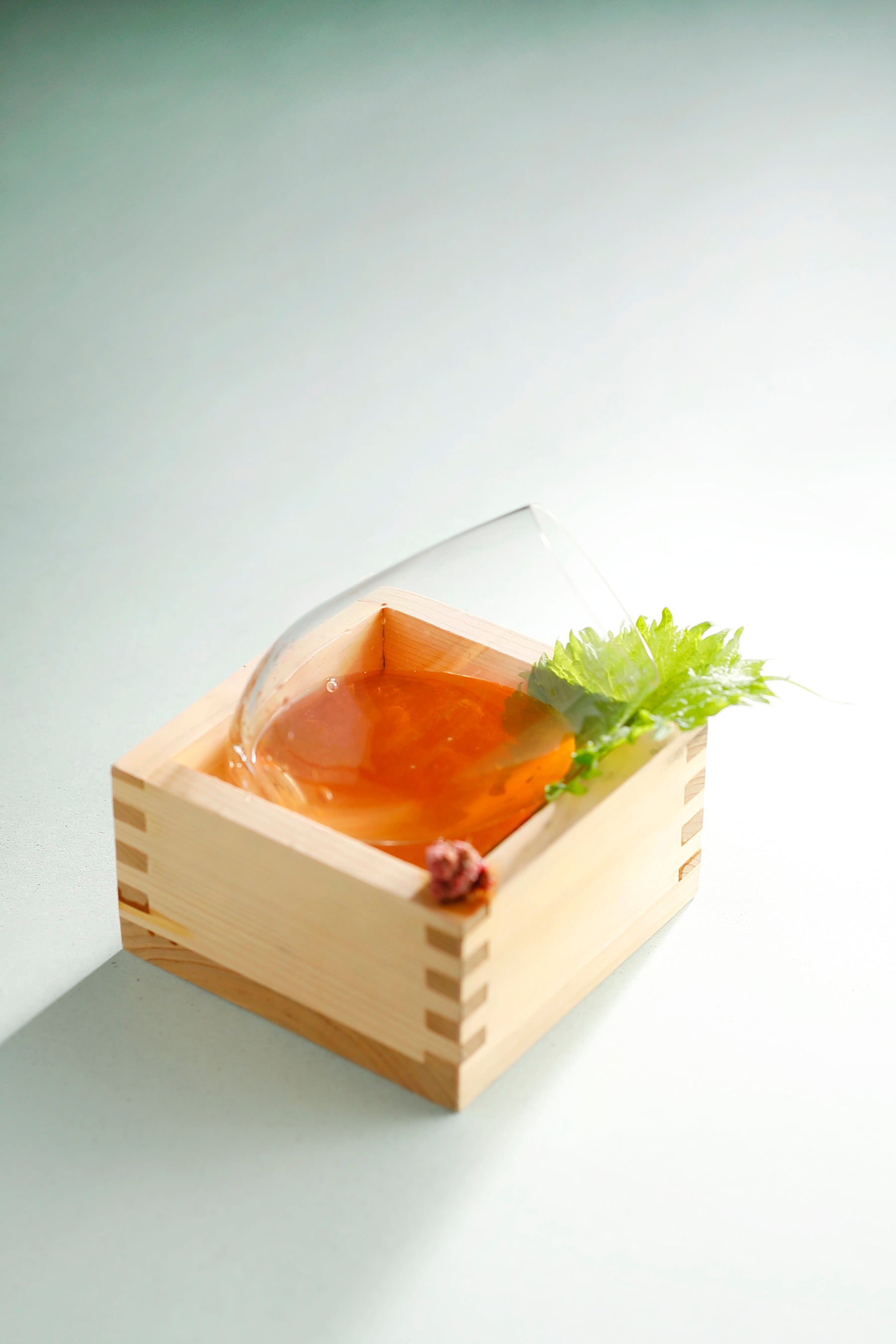 檜桝に入れたタンブラーと、フチに添えられた桜花漬が印象的な、風情ある一杯。ジンと紫蘇リキュールをベースに柚子を効かせ、ほのかに桜の香りが漂います。日本の"和"を感じることができる、春ならではのカクテルです。