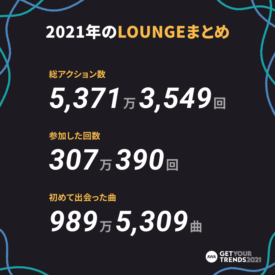 LOUNGE提供開始から、アーティストにフォーカスしたイベントは150回を超え、ユーザーによる開催は2万回を超えています。また、コメント、スタンプ、リクエストなどでリアクションされた回数は5,300万回以上にのぼり、のべ参加回数は300万回を数えます。LOUNGEでユーザーがまだ聴いたことの無い楽曲に出会った曲数は989万回。LOUNGEは新たなアーティストやユーザー同士のコミュニケーションを深める場として広く活用されています。