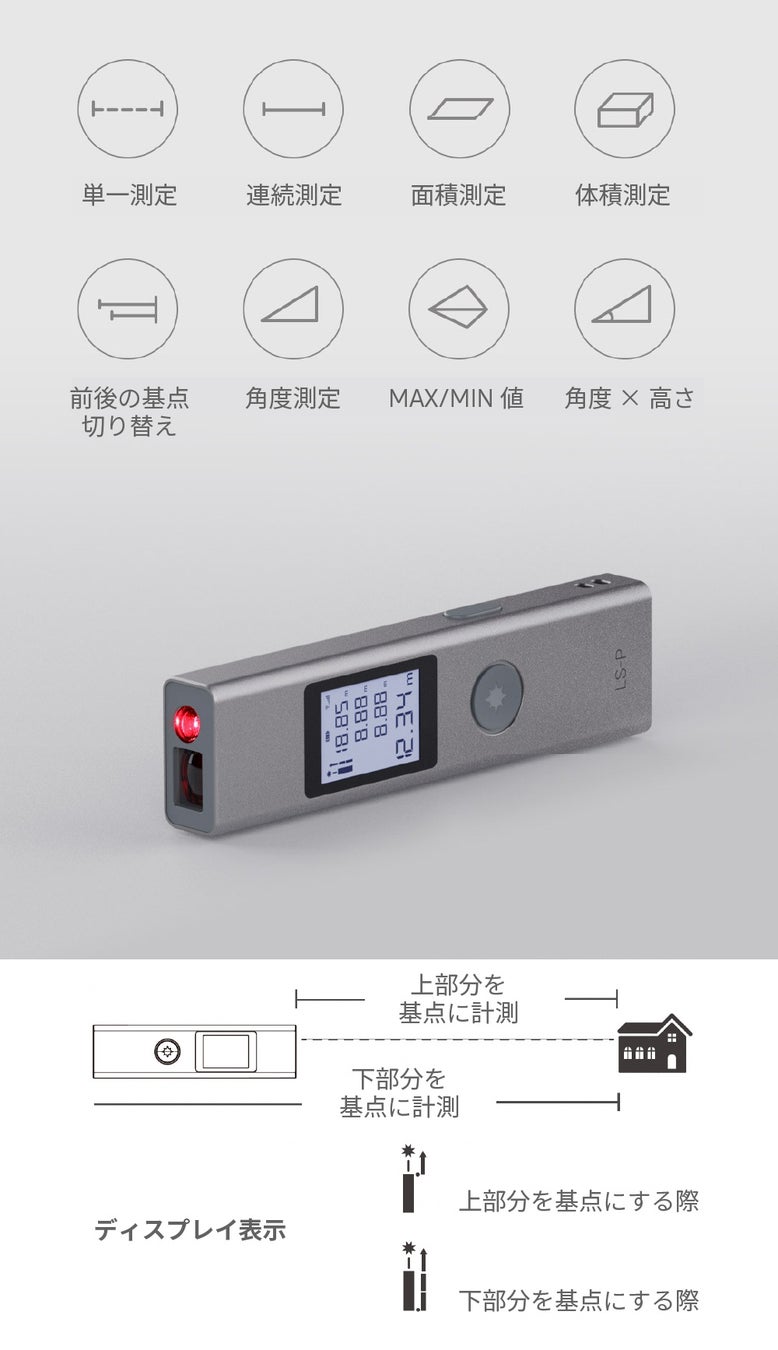 また、基点を本体の上部/下部に切り替えて設定ができるので、例えば、壁に密着させて計測したい場合は下部の底基点に開始するなど、計測したい状況に合わせてスムーズにご利用ができます。