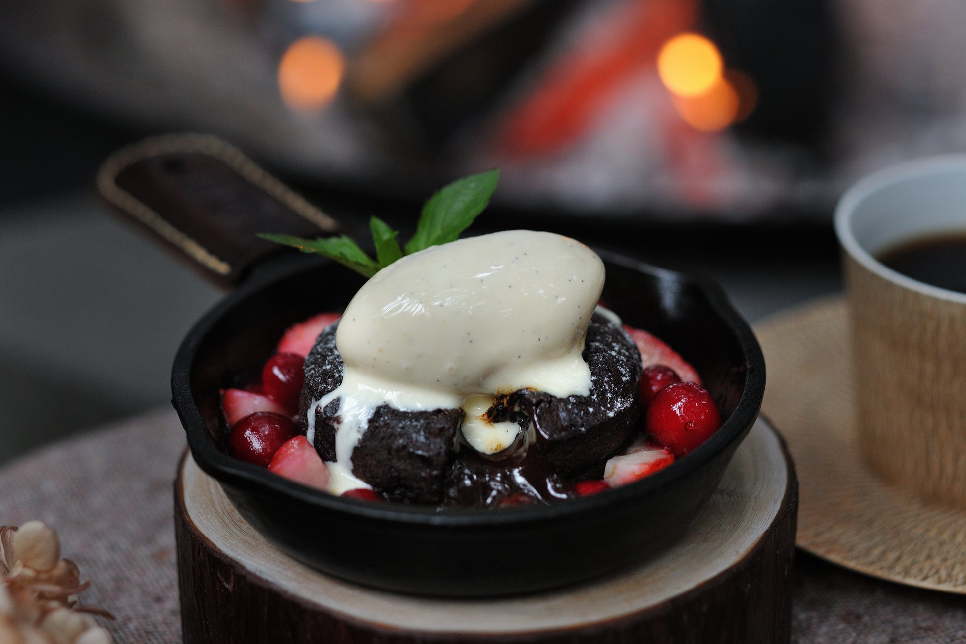 午後のクラウドテラスで楽しむ「森のひととき」では、燻製フォンダンショコラを提供します。濃厚に焼き上げたフォンダンショコラに林檎チップのスモークを閉じ込めた、燻製香とカカオの甘い香りが楽しめる一品です。仕上げにバニラアイスクリームとベリーソースを合わせます。冬の森の静けさの中で過ごす、贅沢なスイーツタイムです。