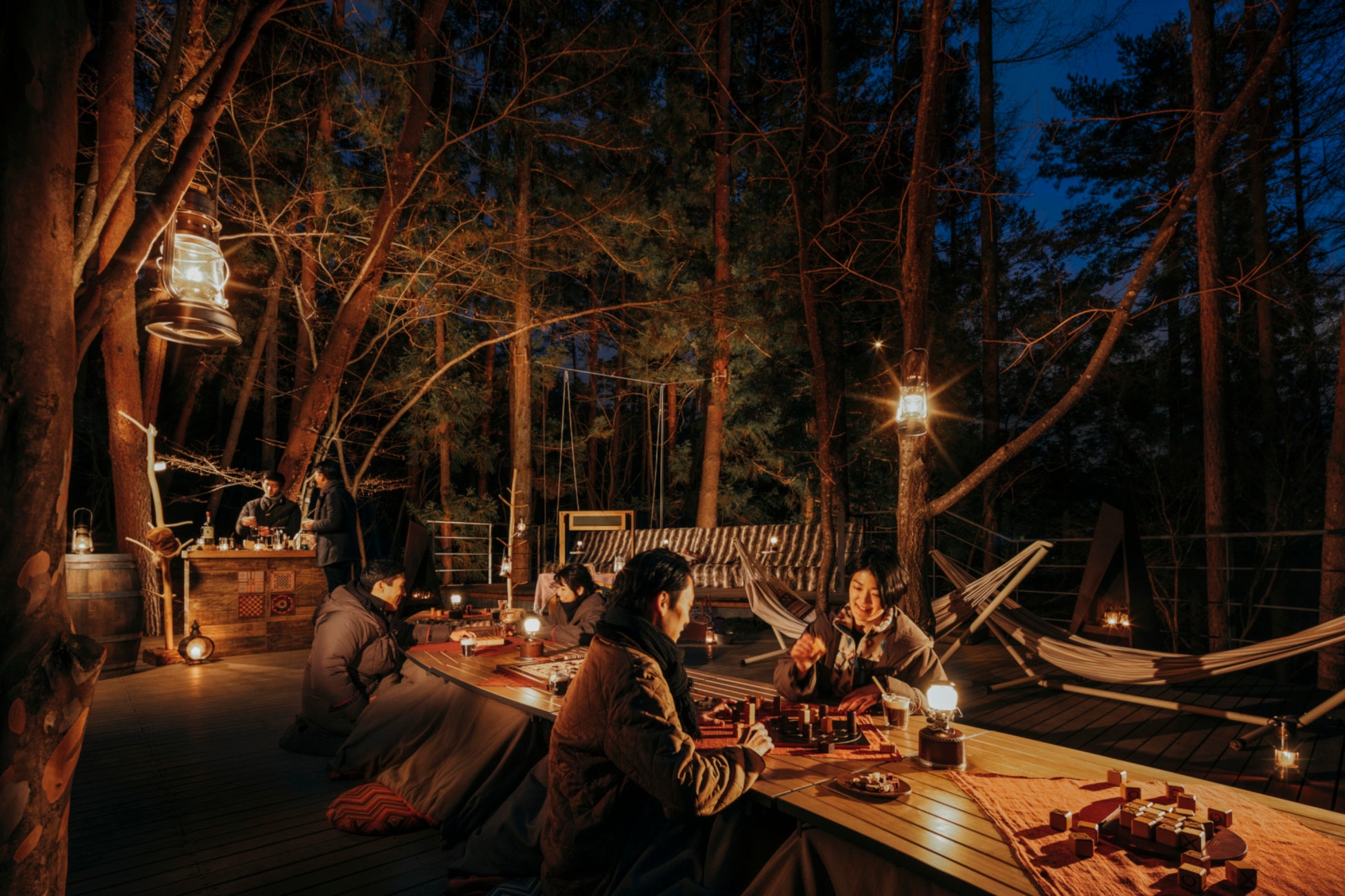 木漏れ日デッキには、「森ごもりラウンジ」が登場します。屋外の澄んだ空気を感じながら、こたつに入ってゆったりと寛げるユニークな空間です 。焚き火の炎のはぜる音をBGMに、家族や友人とボードゲームで盛り上がったりと思い思いに過ごせます 。冬の夜だからこそ感じられる森の静けさや美しさを満喫できる、遊び心あふれるラウンジです。