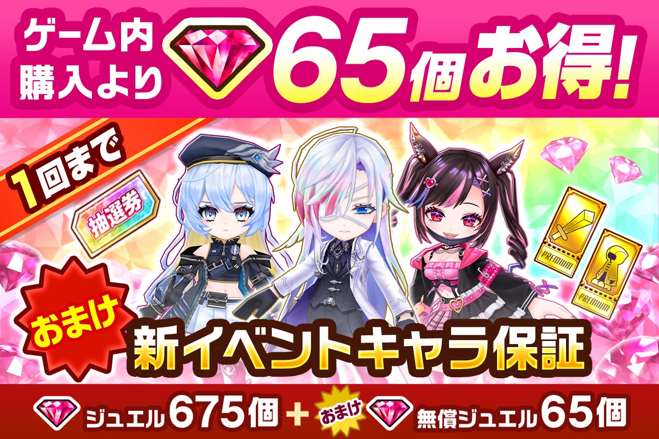 内容物:「ジュエル」675個、「無償ジュエル」65個、「新イベントキャラ保証」など