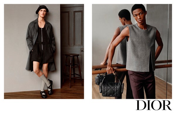 機能性と詩的さ、実用性と優美さを融合させ、キム・ジョーンズが考案した2024-2025年ウィンター メンズ コレクションは、プレタポルテのリアリティとクチュールのドラマチックさを融合させました。バレエ芸術への賛歌のように、これらのルックは時代を超越したエレガンスに溢れるものであり、ルドルフ・ヌレエフの華麗なるエスプリが息づいています。色彩と洗練が奏でるパフォーマンスはアラスデア・マクレランが撮影した魅惑的な写真によって強調されています。ダンススタジオを彷彿とさせるシンプルな装飾の中心で、これらのアイテムはメゾンのアーカイブから再解釈された新しいクリエイションとして展開されます。テイラリングは新しいカッティングで刷新される一方で、アイコニックな「バー」ジャケットはマスキュリンで新しいスタイルに落とし込まれ、「オブリーク」スーツと融合しました。規律とラグジュアリーの間を揺れ動くハイソックスは多様なウールのジップショートパンツやセカンドスキンのリブニットと共にスタイリングされています。鏡を見つめるバレリーナにインスパイアされた大胆なシューズを身に纏うモデルたち。「サドル」ツインや、「マキシカナージュ」の建築的なグラフィックで強調された「カメラバッグ」に代表されるように、流れるようなカーブを描くレザーグッズは、実用性と現代性のバランスを共存させています。クチュールの魔法を讃える、崇高で魅惑的な振り付けともいえるこのコレクションは、全国のディオールブティックおよび公式オンラインブティックで8月上旬より順次ご覧いただけます。