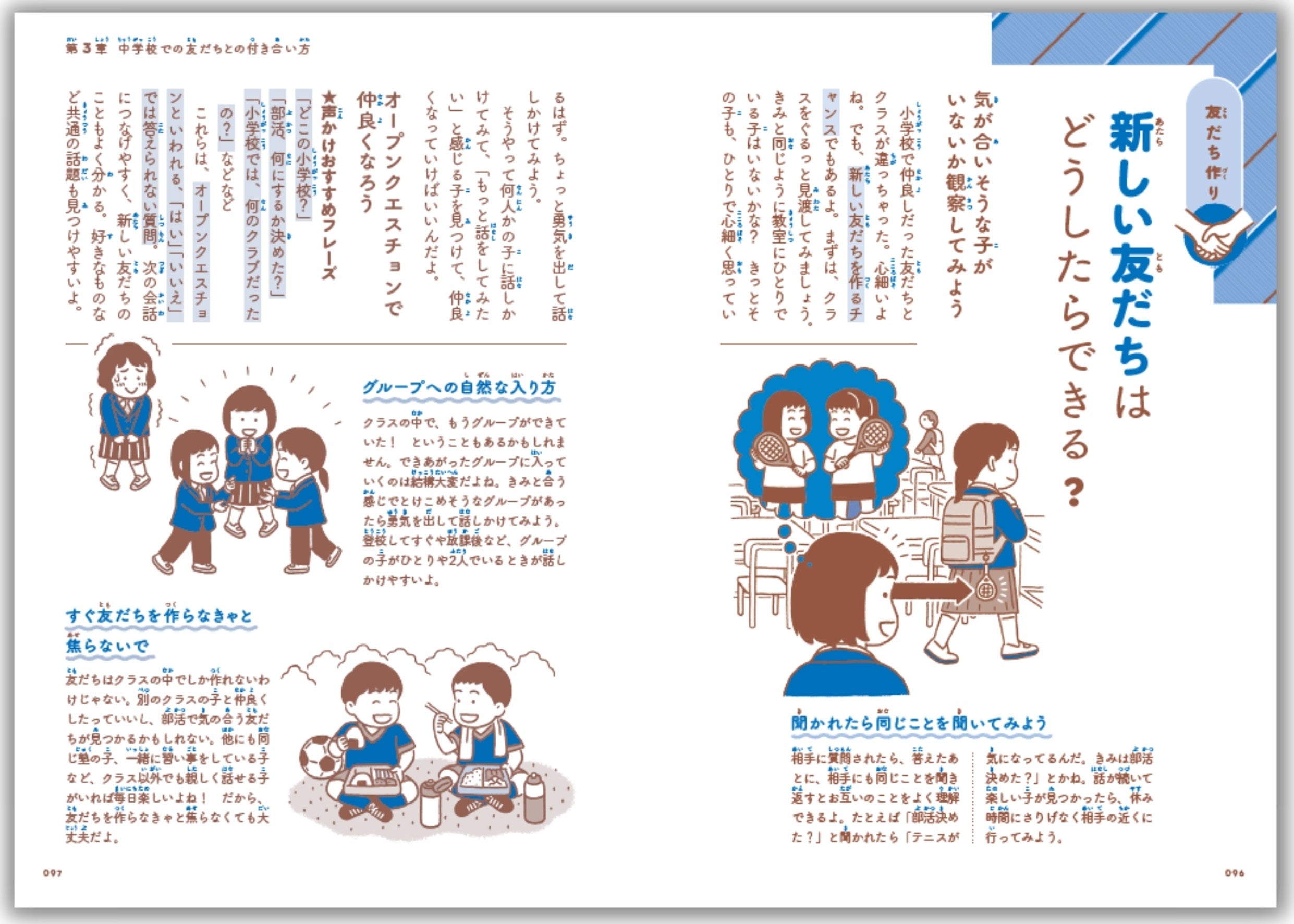 本書は、入学前に知っておきたい効率的な勉強方法や部活の様子から、入学後も役立つ友だちとの付き合い方・SNSの使い方など、楽しい中学生活のコツが盛りだくさん。中学3年間のお守りになる1冊です。