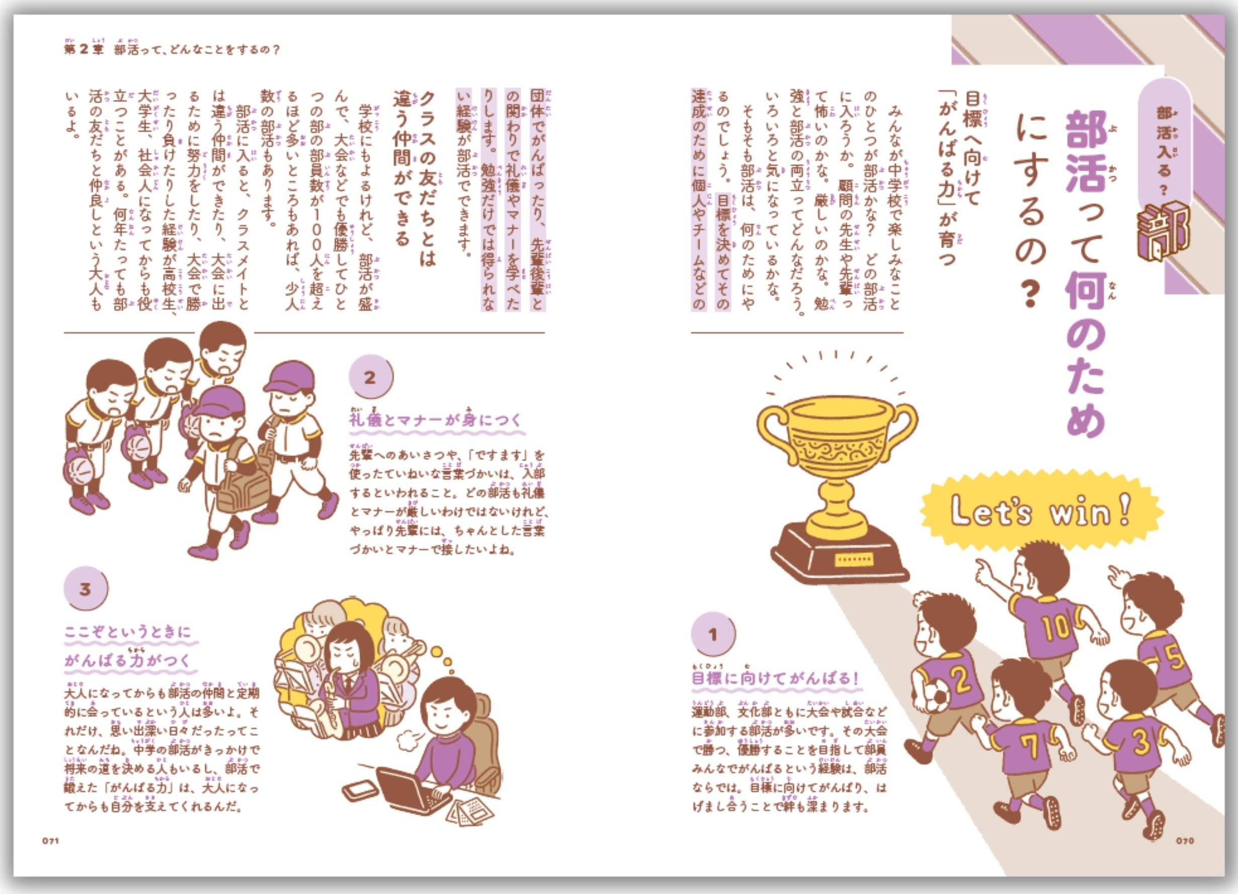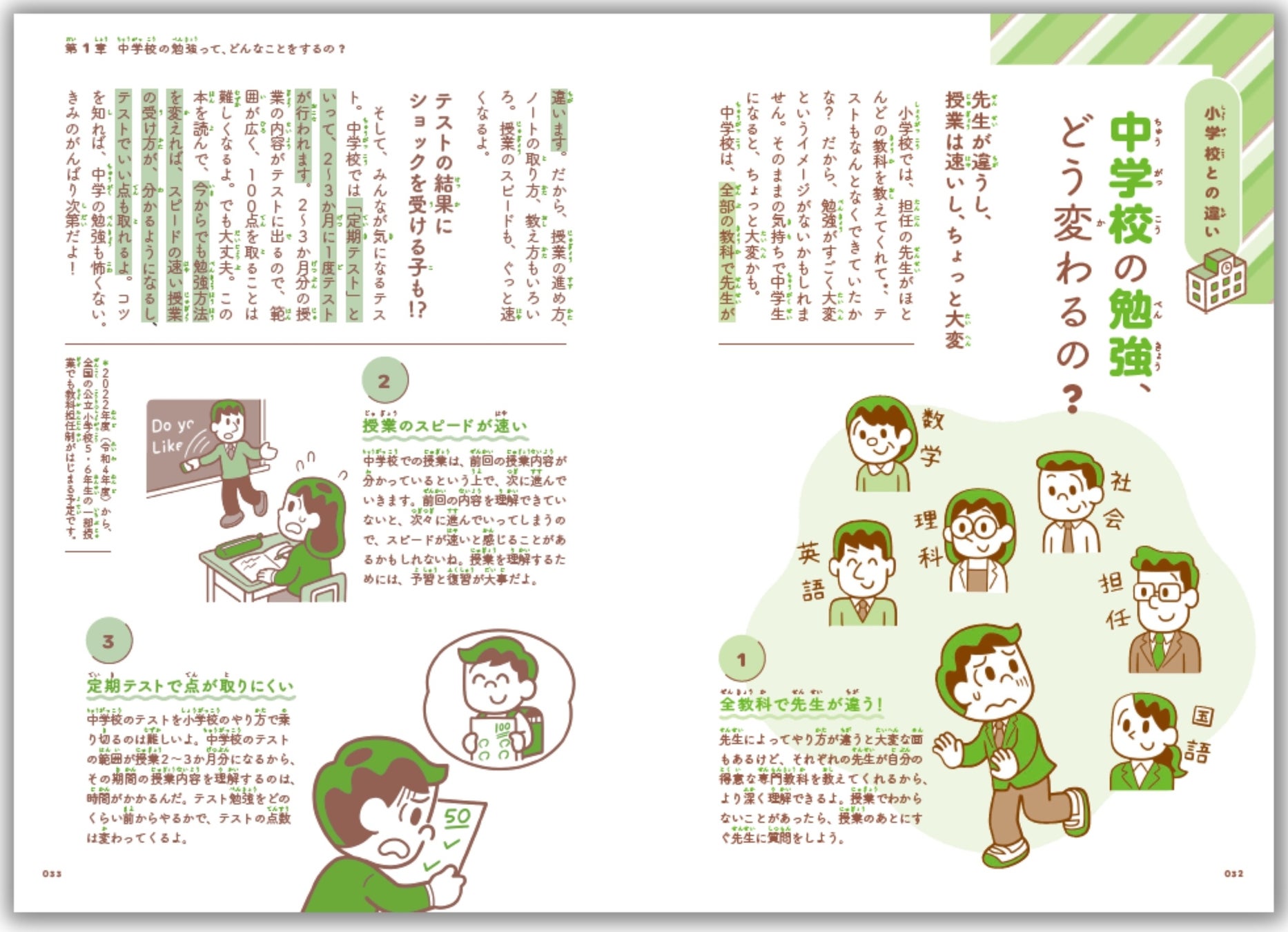 あらかじめ中学校の様子を知っておくことは、「中1ギャップ」対策にもつながります。ぜひ親子でお役立ていただきたい1冊です。