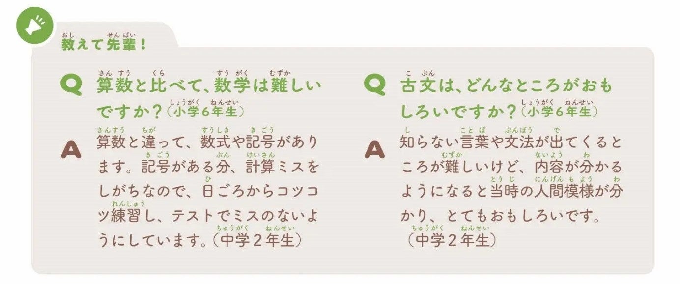 情報ページにもイラストがたっぷり。「教えて先輩!」コーナーでは、現役小学5~6年生からの質問に、現役中学生がリアルに答えたQ&Aを掲載しています。
