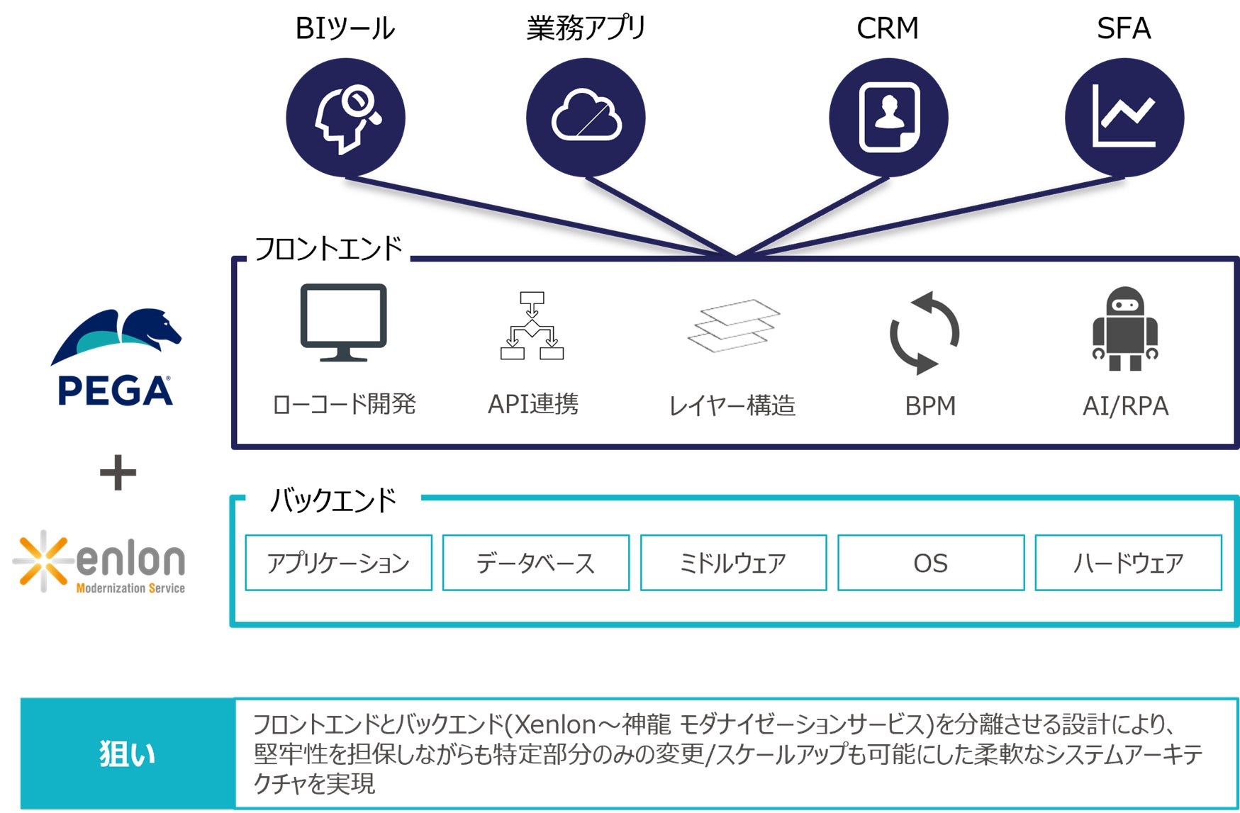 そこでTISは、Pegasystemsとパートナーシップ契約を締結し、「Pega Infinity」を活用して柔軟性・俊敏性の高いフロントエンドを構築するとともに、機動性・堅牢性が求められるバックエンドについては、「Xenlon~神龍 モダナイゼーションサービス」をこれまでどおり活用して構築することで、よりお客様のニーズにあった基幹システムのモダナイゼーションを支援します。