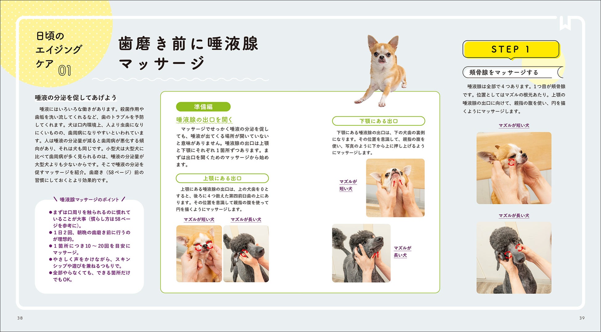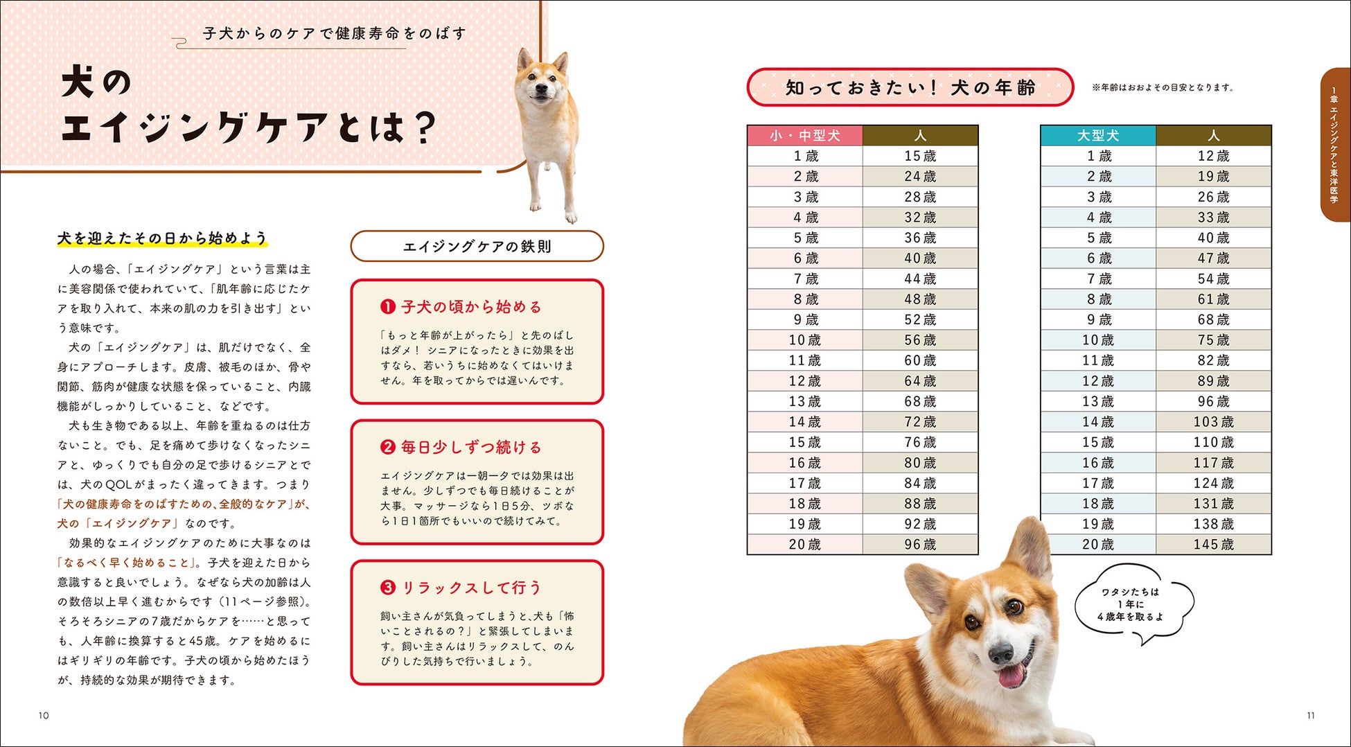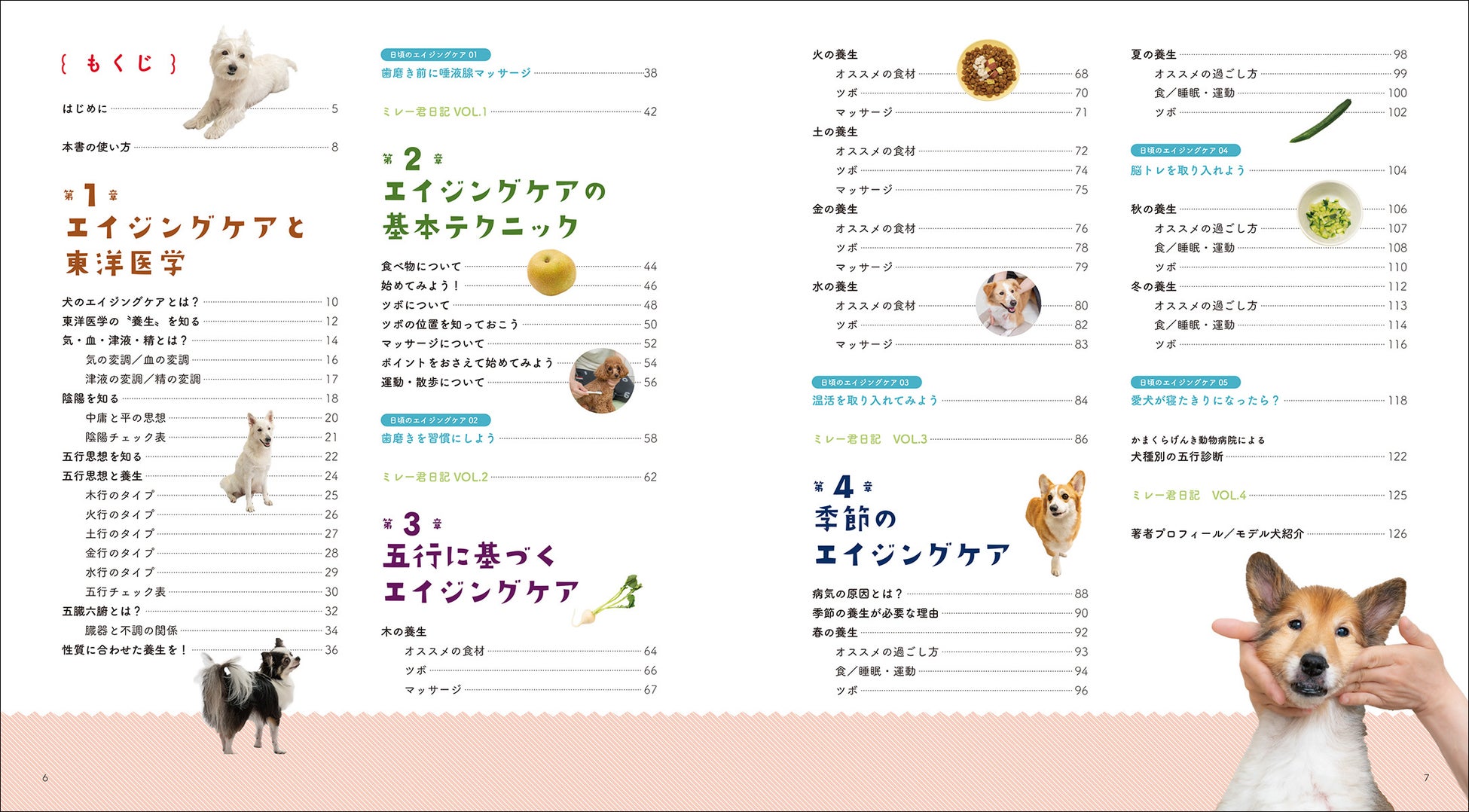 ツボをとらえたマッサージ、旬の食材を取り入れた食事・トッピング、関節痛など犬が隠しがちな痛みをケアする温活、口腔ケアなどさまざまなエイジング方法があります。