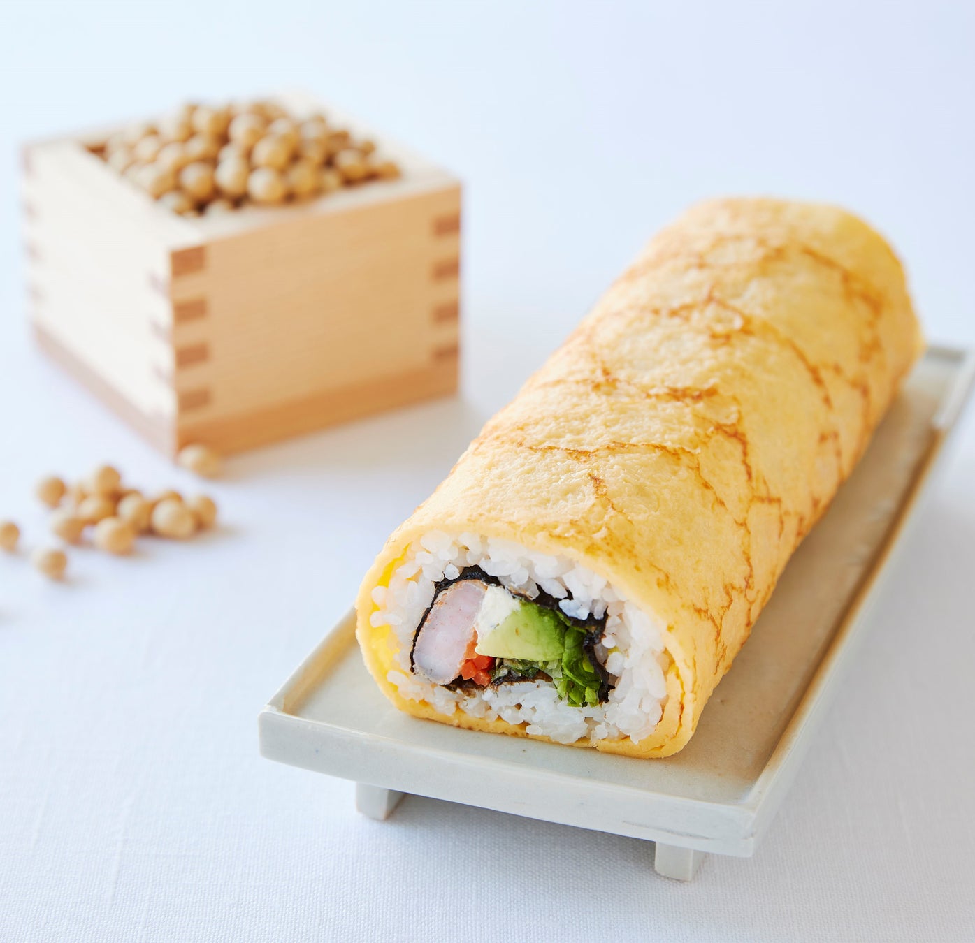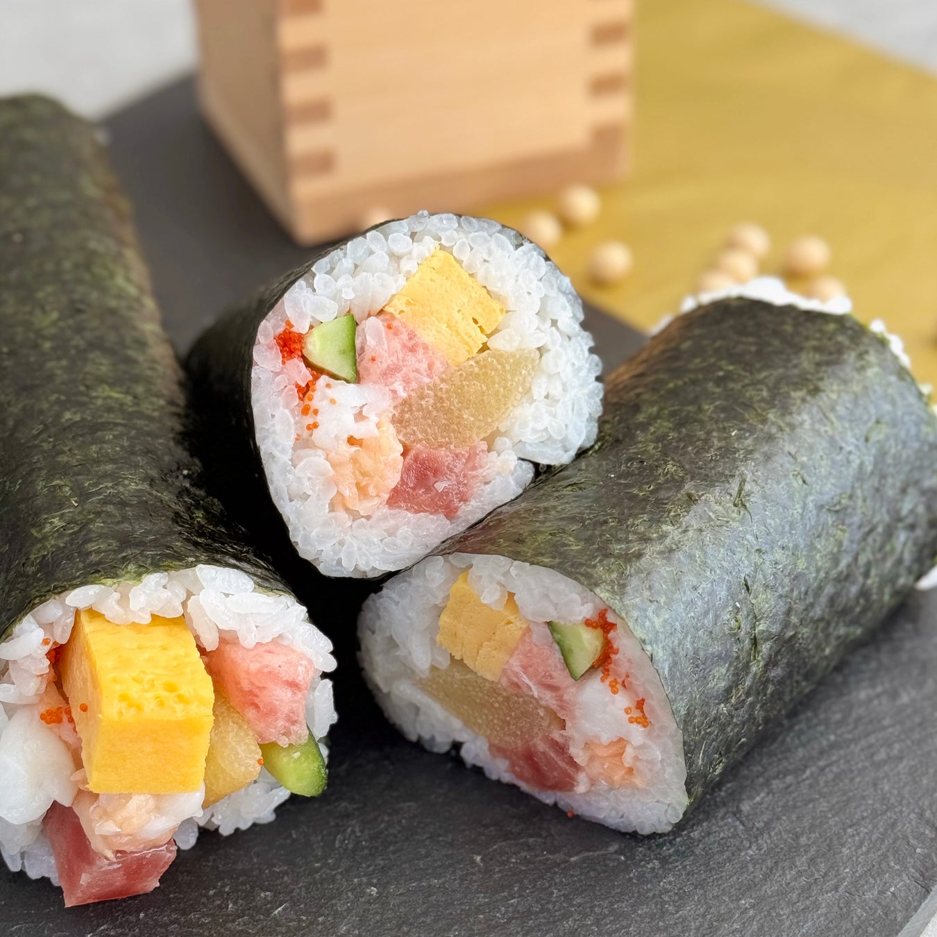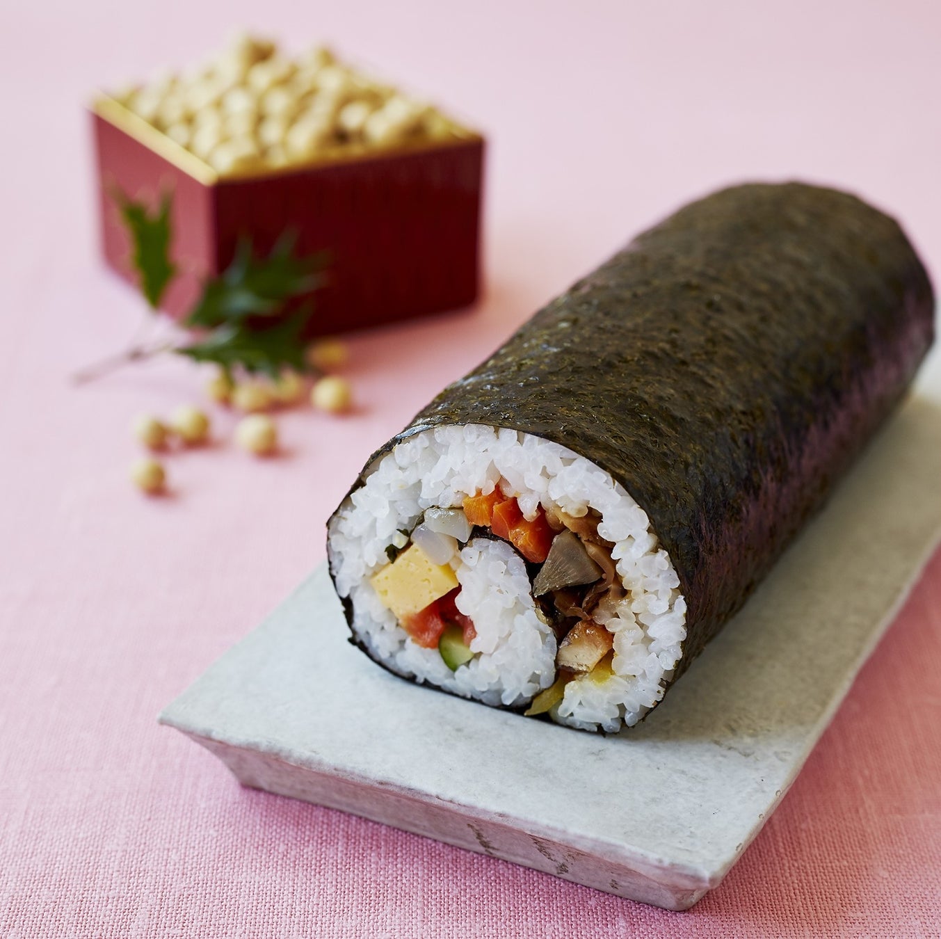 ご飯の部分に恵方巻が入り、鬼や邪気を追い払う「イワシ」や「大豆」を使った
