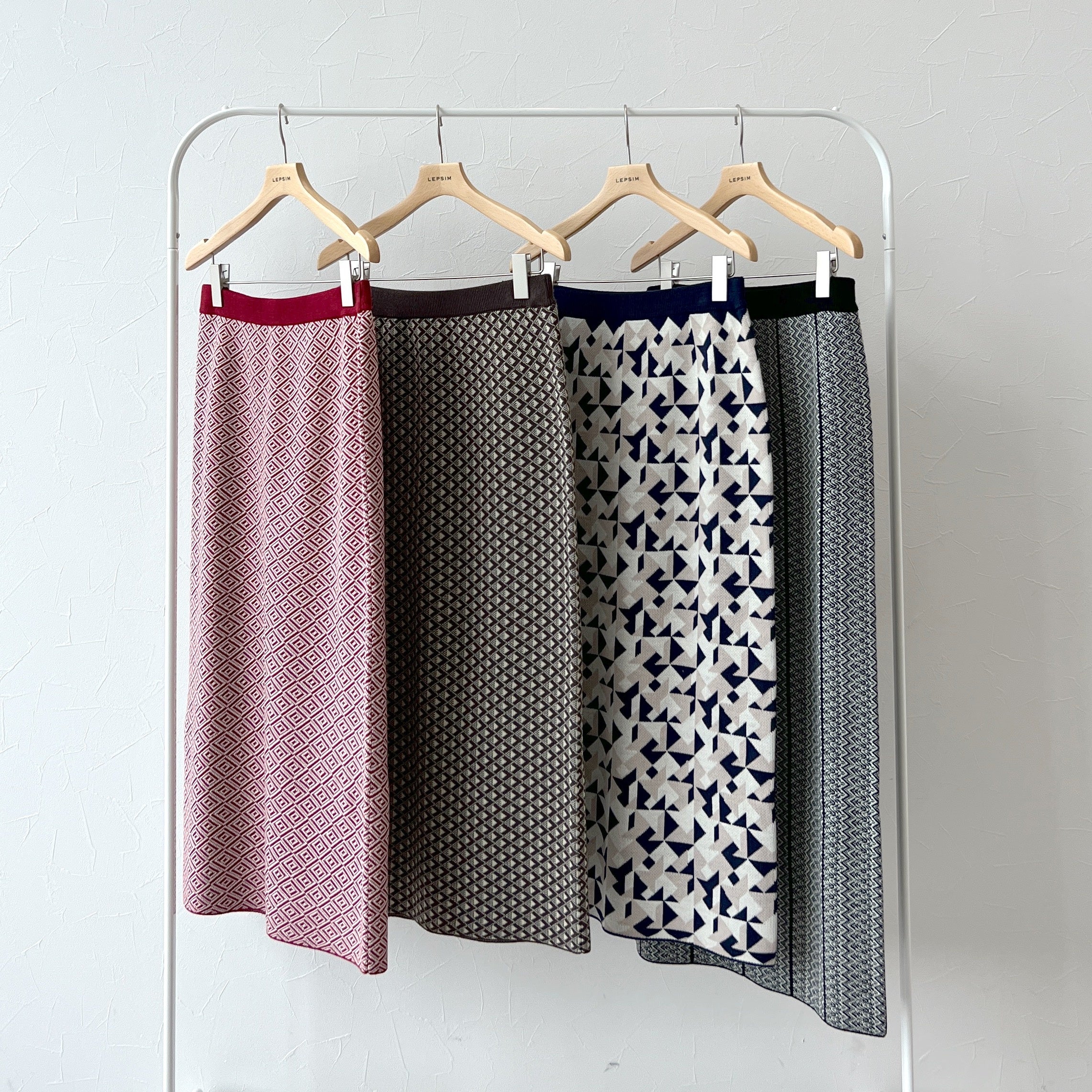 柄物のニットスカートはトレンド感があり、コーデのポイントにぴったりなアイテム。ニットならではの柄の表情が可愛らしい印象です。