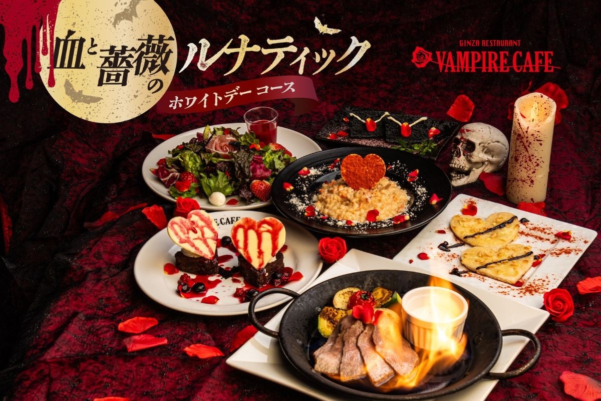 株式会社DDグループの連結子会社である株式会社ダイヤモンドダイニング(本社:東京都港区、代表取締役社長:松村 厚久)が運営する『銀座レストラン VAMPIRE CAFE(ヴァンパイア カフェ)』は、2026年3月1日(日)から3月31日(火)までの1か月限定で「血と薔薇のルナティックホワイトデーコース」と、オリジナルカクテル「エターナルロマンス」を展開いたします。