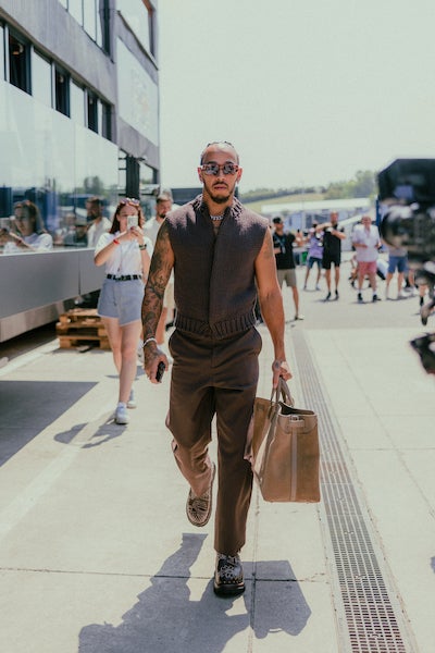 ルイス・ハミルトンは、2025年サマー メンズ コレクションから、ブラウンのコットンジャージー製のスリーブレスカーディガンにブラウンのコットンパンツを纏い、ライトブラウンのスエードノルマンディトートバッグとブラウンのスタッズがあしらわれたケープタウンブーツを合わせました。