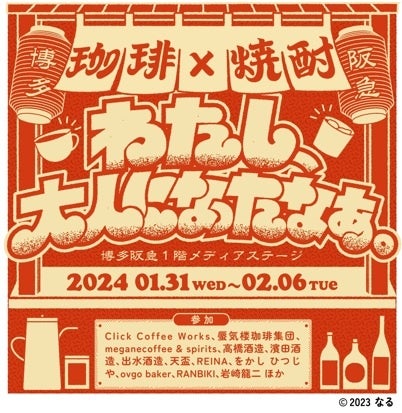 また、もう一人の担当者は、阪神本店で焼酎ナビゲーターを務めた程、焼酎が好きで、“焼酎を飲みながら過ごす楽しい時間”を同世代に伝えたいという想いで企画しました。「若者のアルコール離れ」が話題に上がる中、若い世代に受け入れられるよう、サッパリ・フルーティーな“サパフル焼酎”の飲み比べを提案します。“きっかけの一杯”を通じて焼酎のイメージが変わるはずです。見知らぬ人とのコミュニティが広がる“屋台”をイメージした空間が登場し、コーヒーや焼酎をお楽しみいただけます。