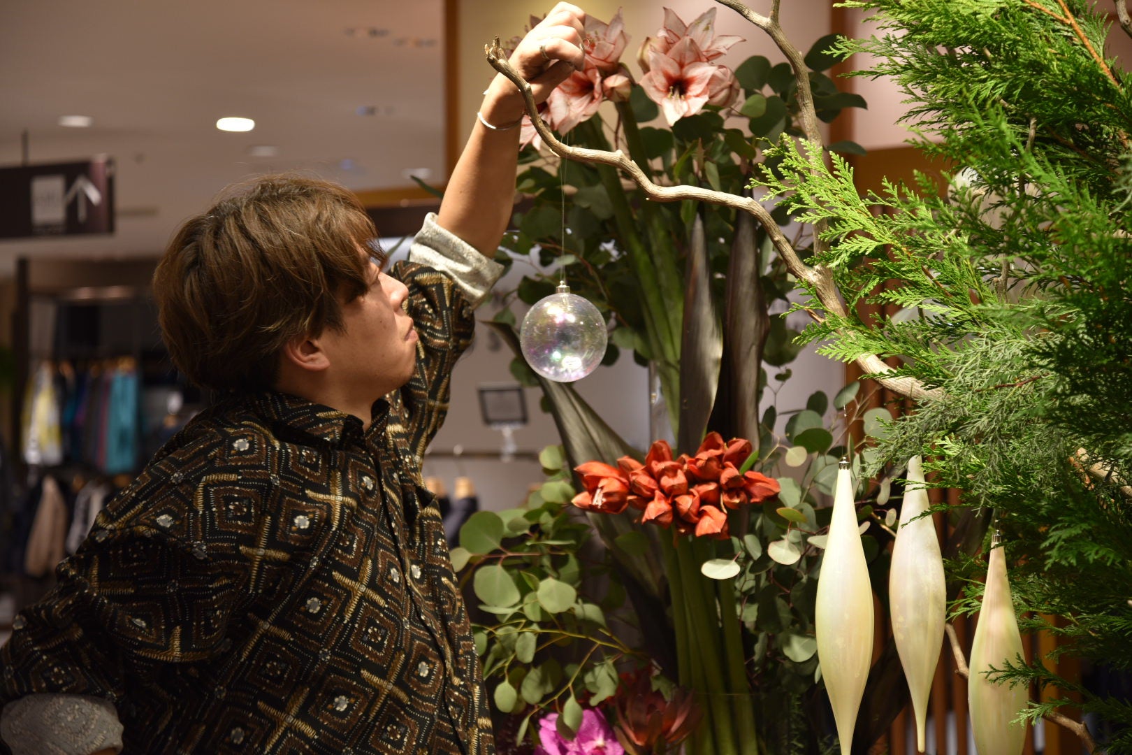 企画担当者が本多さんの手掛けたフラワーアレンジメントを拝見したのをきっかけに、花を美しく見せる花器にも興味を持つようになったそう。元々繋がりのある「ガラス工房マル」さんに花器を制作依頼し、花に合う花器を作っていただきました。
