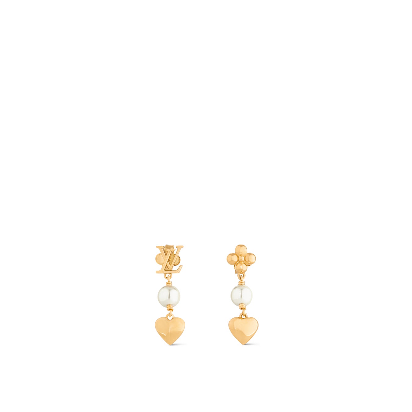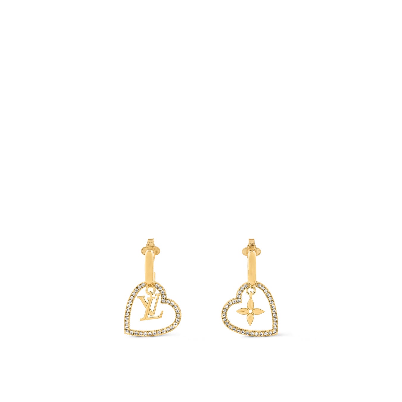 「ピアス·マイLV ハート」は、ゴールドカラーのメタルにきらめくジルコンをあしらいアシンメトリーなデザインに仕上げました。片方はハート型のフープでモノグラム·フラワーを囲み、もう片方にはLV イニシャルを配しています。グラマラスで洗練された装いに上品な個性を添えるラグジュアリーでエレガントなアイテムです。