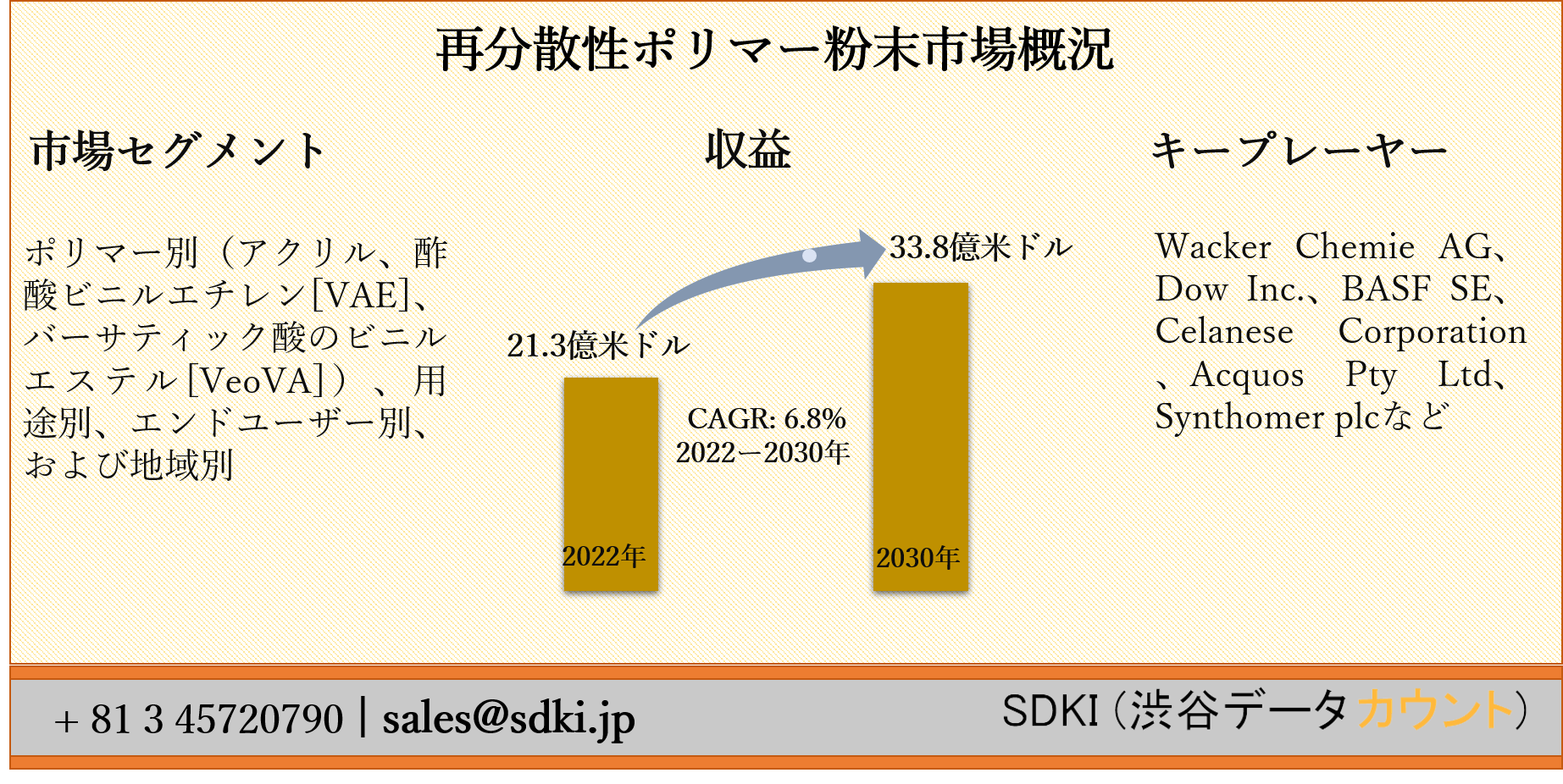 再分散性ポリマー粉末市場は、2022年に21.3億米ドルの市場価値から、2030年までに33.8億米ドルに達すると推定され、2022-2030年の予測期間中に6.8%のCAGRで成長すると予想されています。