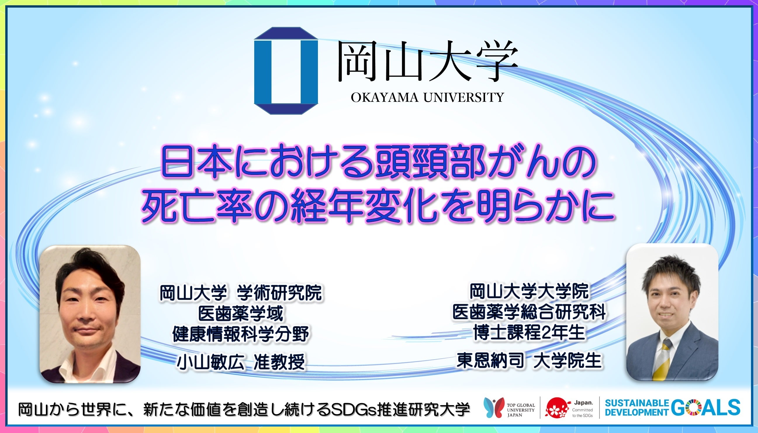 国立大学法人岡山大学(本部:岡山市北区、学長:那須保友)の大学院医歯薬学総合研究科医薬品臨床評価学分野の博士課程2年生の東恩納司と岡山大学学術研究院医歯薬学域医療教育センター薬学教育部門健康情報科学分野の小山敏広准教授、岡山大学病院薬剤部の濱野裕章講師、座間味義人教授らの研究グループは、これまで十分に明らかにされていなかった日本における頭頸部がんの死亡率の傾向を明らかにしました。本研究は国内外の複数の研究機関と医療機関の研究者との共同研究において実施されました。