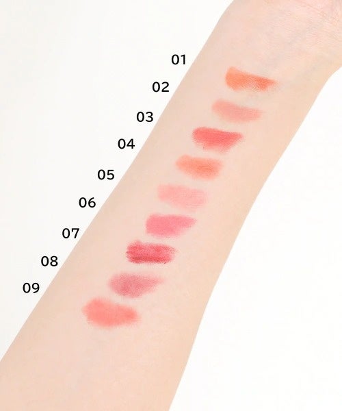 カラー:01サンセットテラコッタ/02コットンピンクベージュ/03マットサテンレッド/04サンライズバレンシア/05シフォンコーラルピンク/06グロウイングローズ/07サンシャインスカーレット/08シルキーモーヴレッド/09メルティアプリコット