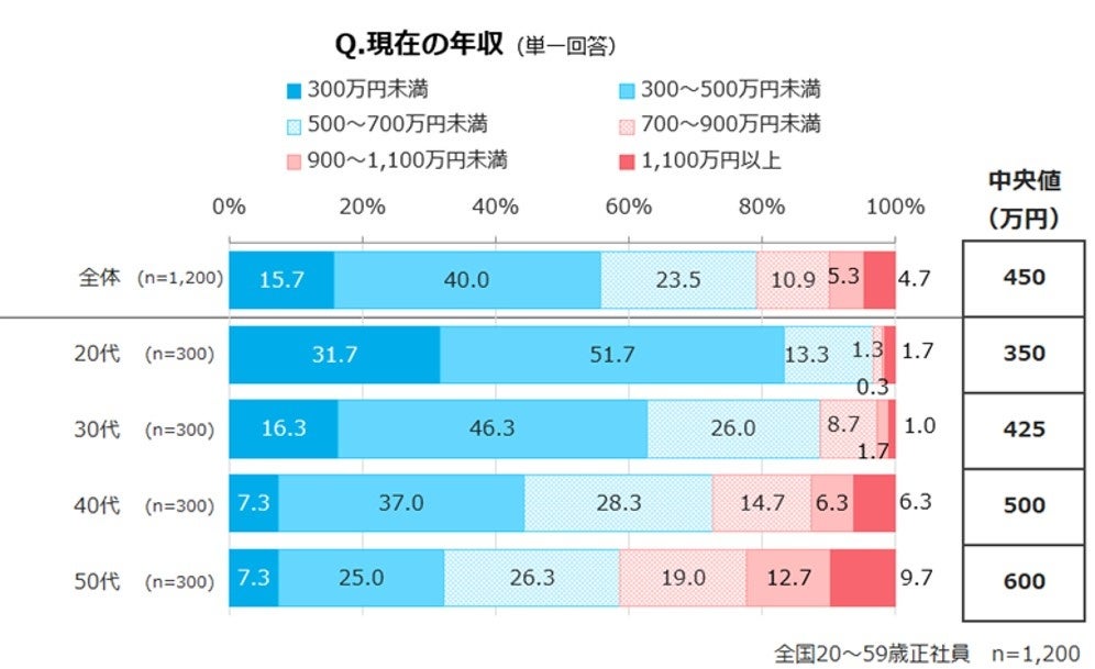- 正社員年収の中央値は450万円で、4割が「低すぎる」と感じている。理想と現実のギャップは約100万円(月額換算8.3万円)【図1、2、3】