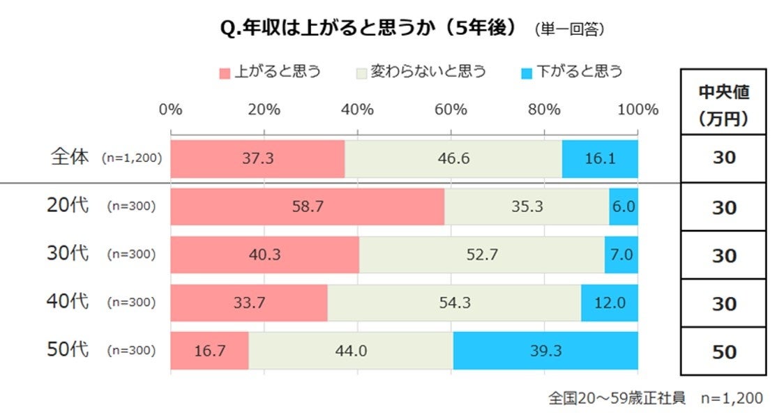 5年前と比べて年収が上がった人は41.9%で、上昇額の中央値は50万円となった。こちらは月額換算すると4.2万円で、物価高や増税の影響を考えると、年収が上がった人でも家計の好転は実感しづらいことがうかがえる。5年後の賃金の見通しは、「変わらないと思う(46.6%)」が「上がると思う(37.3%)」を上回り、賃金の上昇に悲観的なことがわかる。【図4、5】