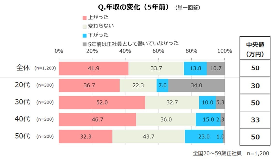 - 5年前と比べて年収が上がった人は4割。5年後の見通しは「年収は変わらない」が約半数と、賃金上昇に悲観的【図4、5】
