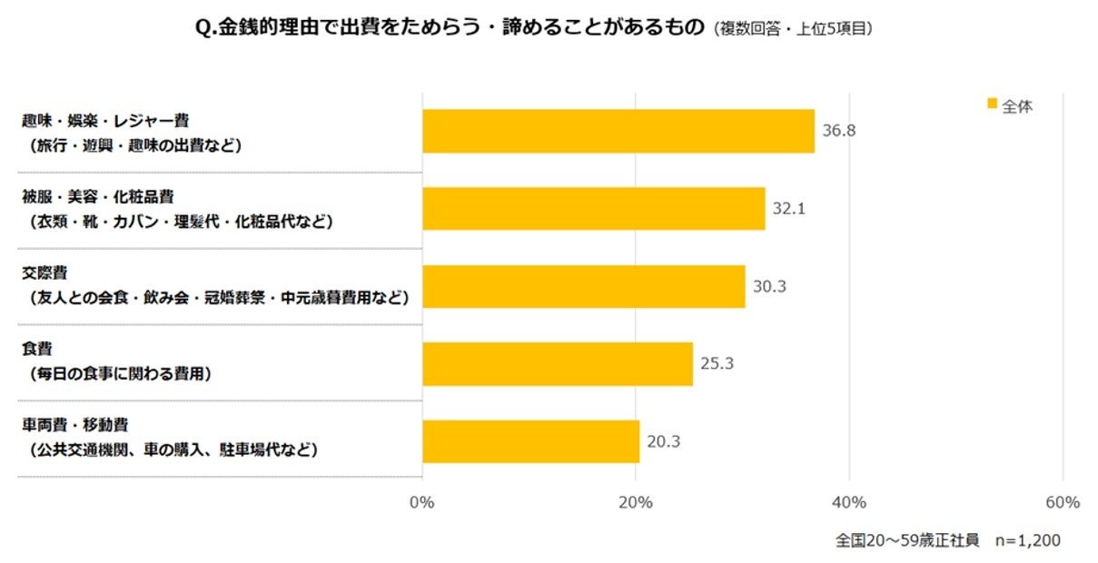 また、金銭的理由で出費をためらう・諦めるものがあるか聞いたところ、「趣味・娯楽(36.8%)」、「被服・美容(32.1%)」「交際費(30.3%)」はいずれも3割を超えた。「食費」は25.3%で、4人に1人が金銭的理由で食費の出費をためらっており、生活苦を感じさせる結果となった。【図6、7】