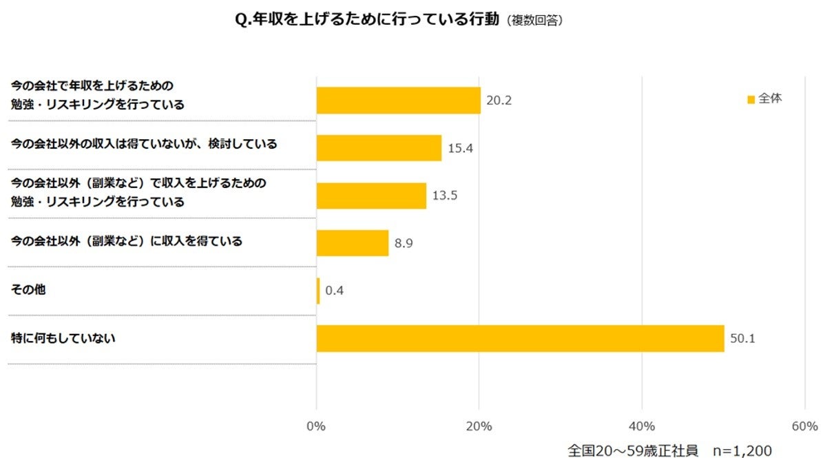 将来の生活への金銭的不安について、「不安」と回答した人は71.5%にのぼった。また、年収を上げるために行っていることを聞くと、「今の会社で年収を上げるための勉強・リスキリングを行っている」は20.2%、「今の会社以外の収入は得ていないが、検討している」は15.4%、と、スキルアップを考え活動・検討している人が一定数いることがわかる。一方、「特に何もしていない」は半数を超える結果となった。【図8、9】