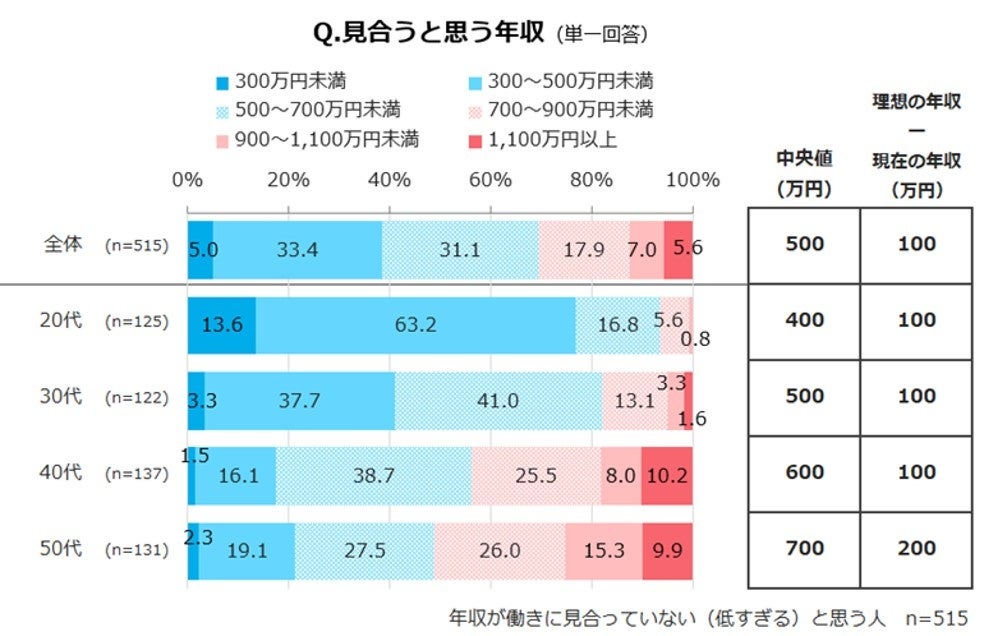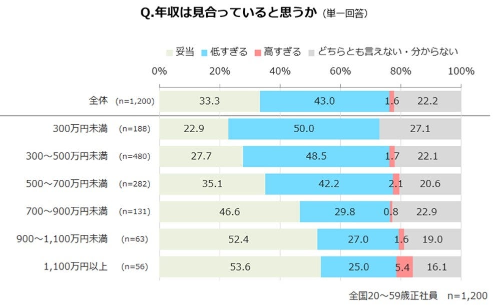 20代~50代の正社員に現在の年収を聞いたところ、中央値は450万円で、20代は350万円、30代は425万円となった。自身の年収が「低すぎる」と回答した人は43.0%で「妥当(33.3%)」を上回り、理想と現実の年収差は100万円(月額換算8.3万円)と大幅にギャップが出た。【図1、2、3】